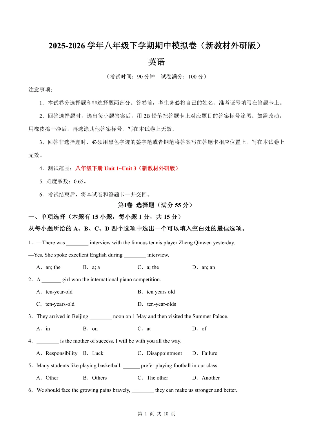 【2026春新版八年级下册英语外研版】初二下册英语《期中模拟测试卷带答案解析》|完整高清可打印