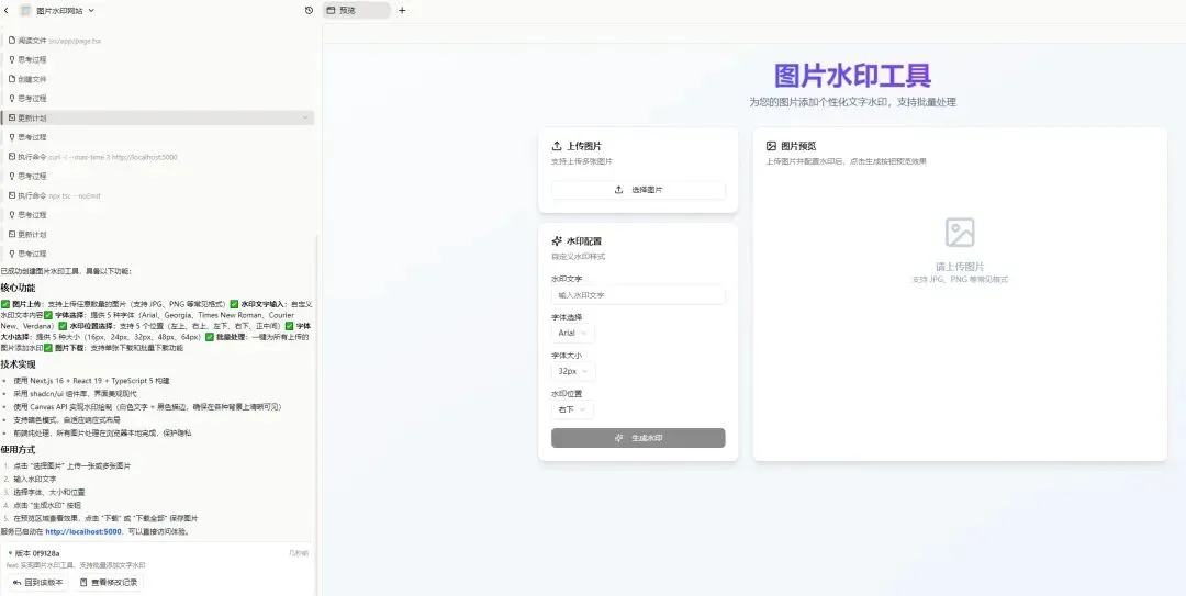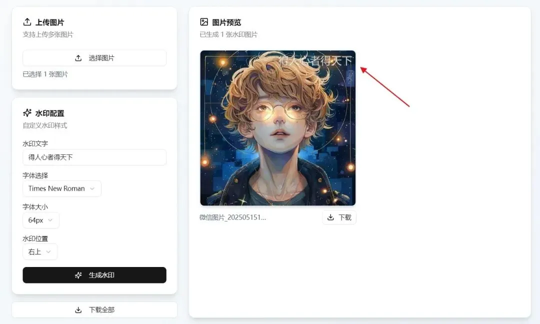 “生成一项功能:为图片加上相应的文字水印;界面包含图片上传、水印文字输入、至少5个水印字体选择、水印位置选择、至少5个水印字体大小;上传任意张图片后,点击‘水印生成’,为图片打上对应的文字水印效果,并提供图片下载功能,水印位置包含:左上、右上、左下、右下、正中间。”