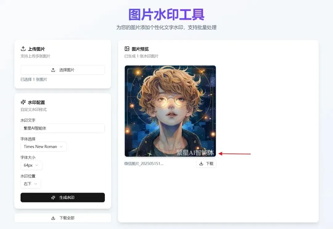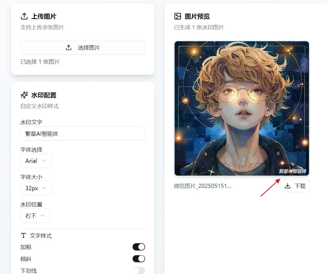 接下来上传图片,输入“繁星AI智能体”作为水印,再选择字体、大小和位置。