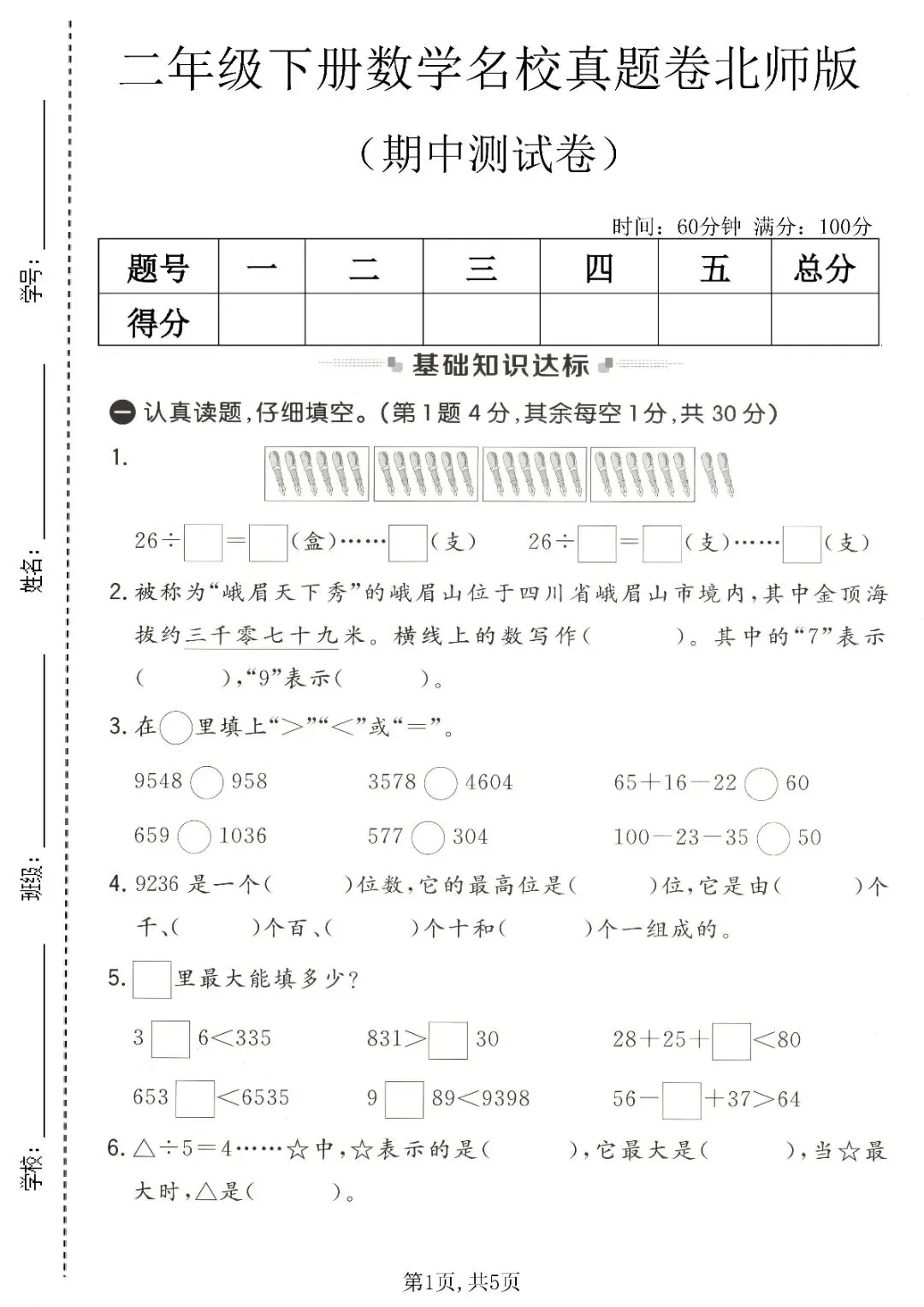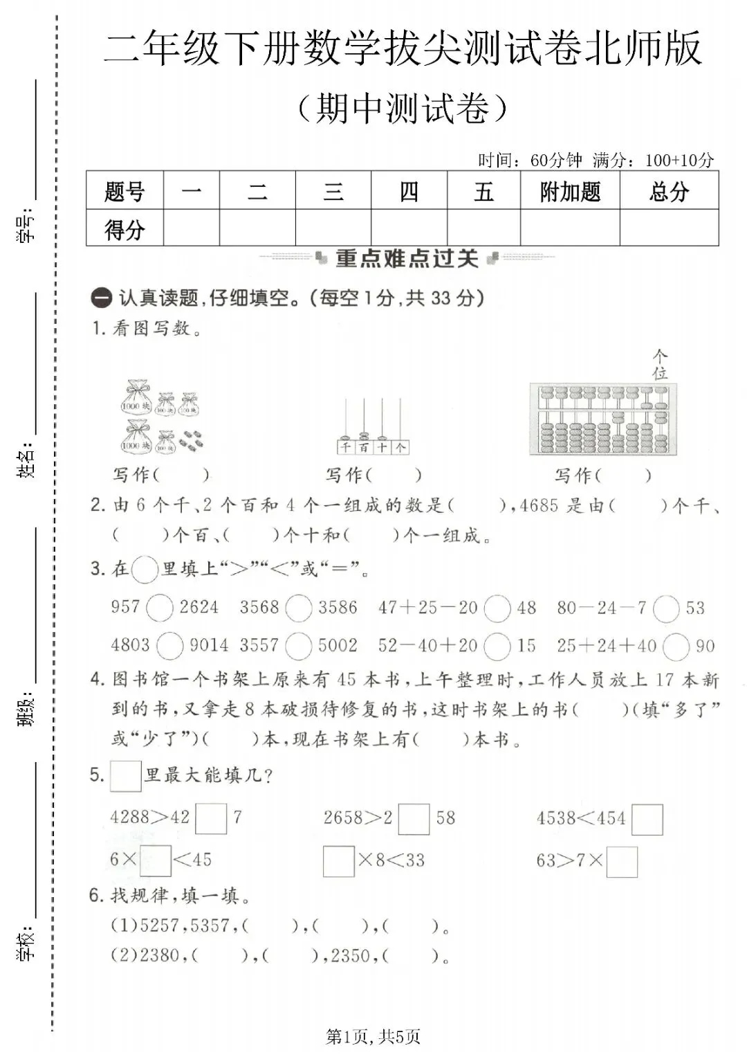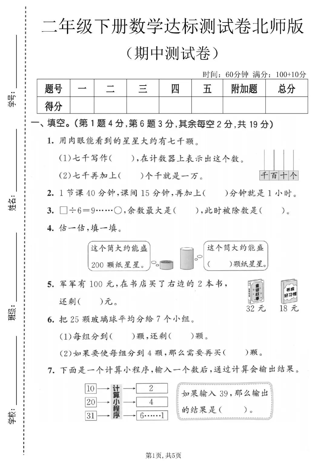 26春北师大版二年级下册数学《期中拔尖测试卷》,共3套,含答案,电子版可打印。帮助孩子巩固所学知识点,查缺补漏,提升学习成绩。有需要的家长快打印给孩子练一练。
