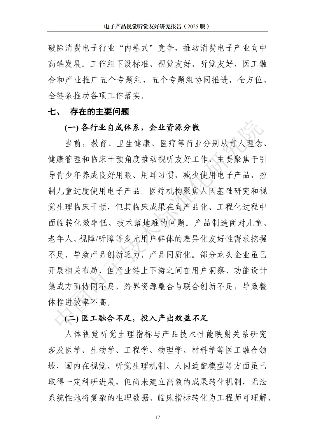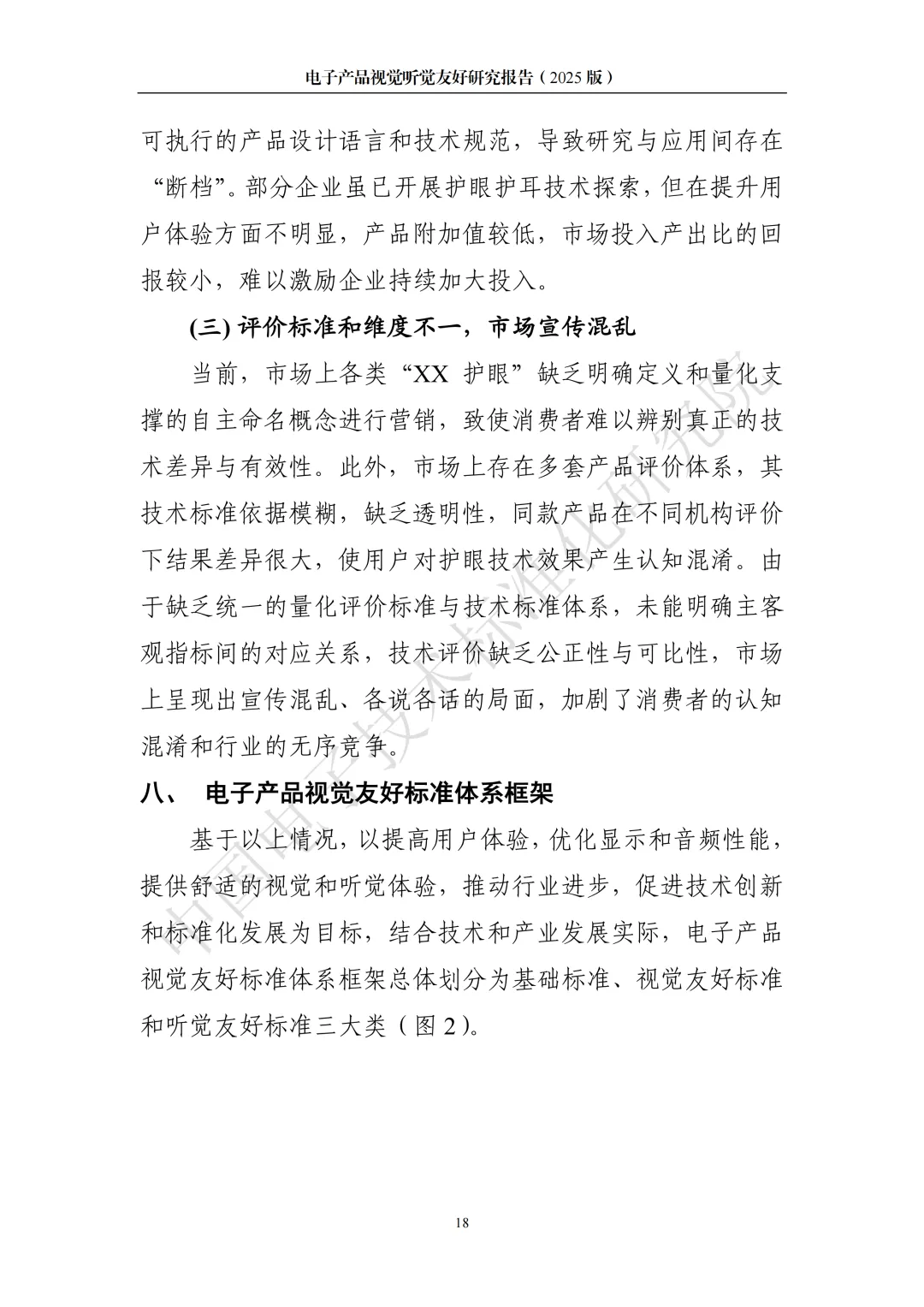 这份报告聚焦电子产品视听友好研究,点明未成年人近视、中老年人眼疾、听力受损低龄化已成民生痛点,视听友好既是民生刚需,也是消费电子产业健康化升级的新赛道与增长点。报告系统剖析了视听健康核心问题,梳理国内外标准体系与产业现状,指出行业协同不足、医工融合薄弱、标准宣传混乱等痛点,并搭建标准框架与推进路线,助力产业向高端化、健康化转型。