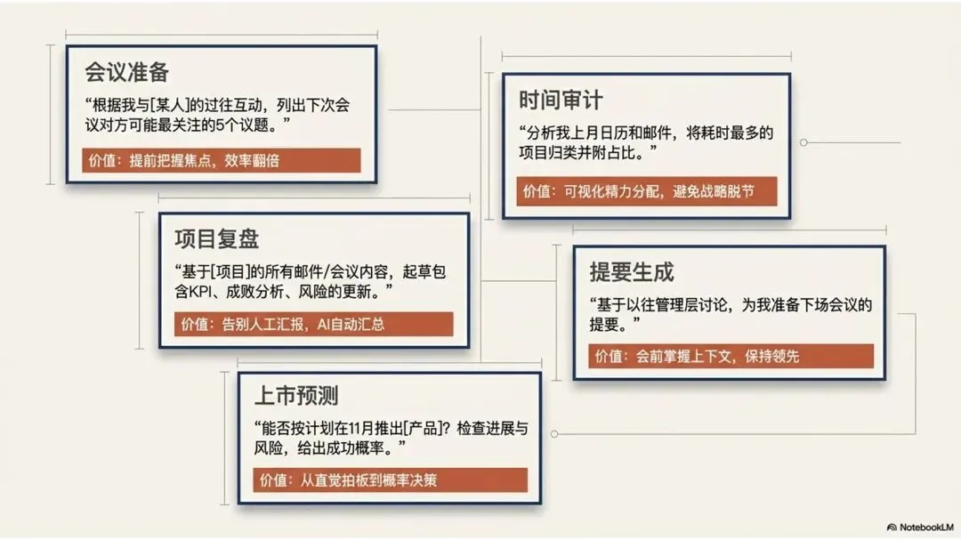 “根据我与[某人]的过往互动,列出下次会议对方可能最关注的5个议题。” |
