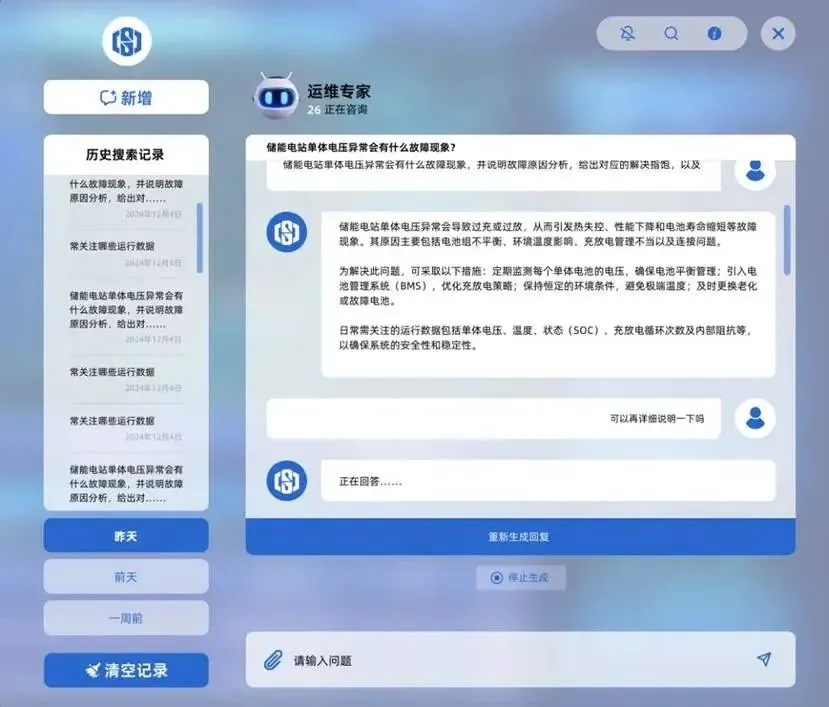 海博思创推出了超级运维助手“海博精灵HyperGenie”,基于国产开源通用大模型和私域储能领域知识库进行设计开发的专属智能体,提供精准故障定位、多场景操作指导、灵活数据分析探索等运维辅助服务。