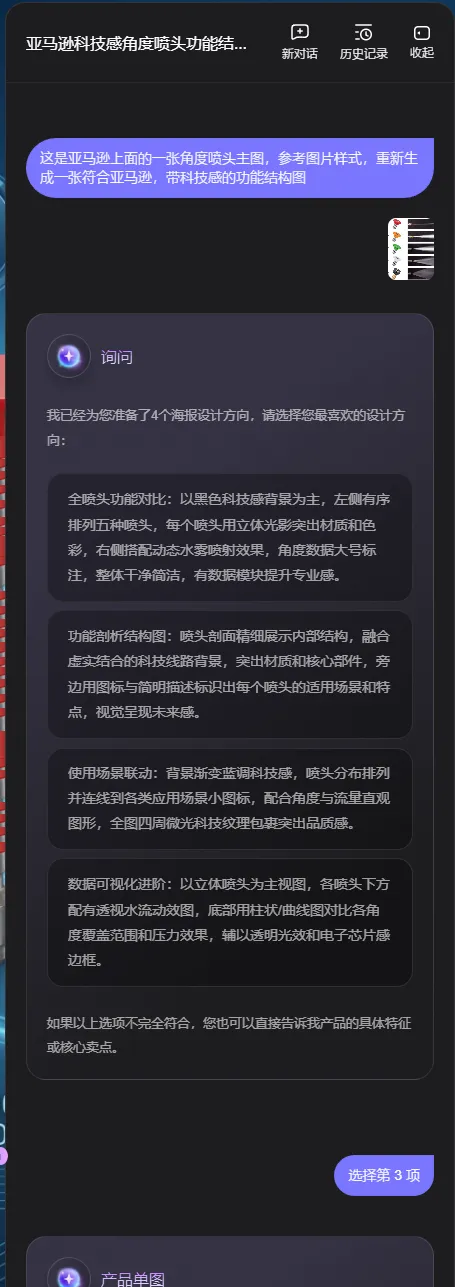 系统会自动进入分析环节,然后会给出几个设计方案给你选择,你选择自己想要的设计方向生成即可。这里我选择第三个风格。