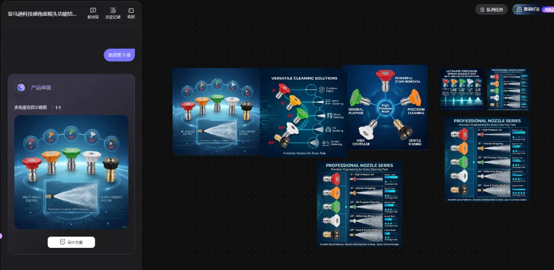 打开AI工具页面,上传一张产品图片,我上传了一张高压清洗角度喷嘴的图片;给出提示词: