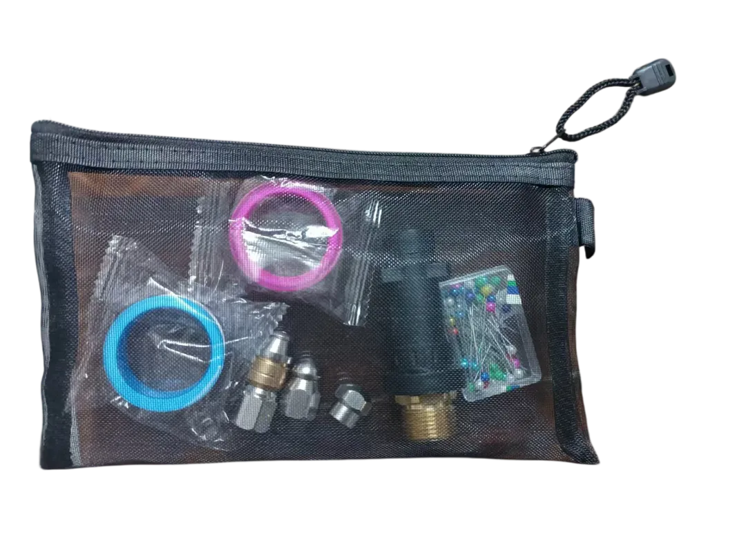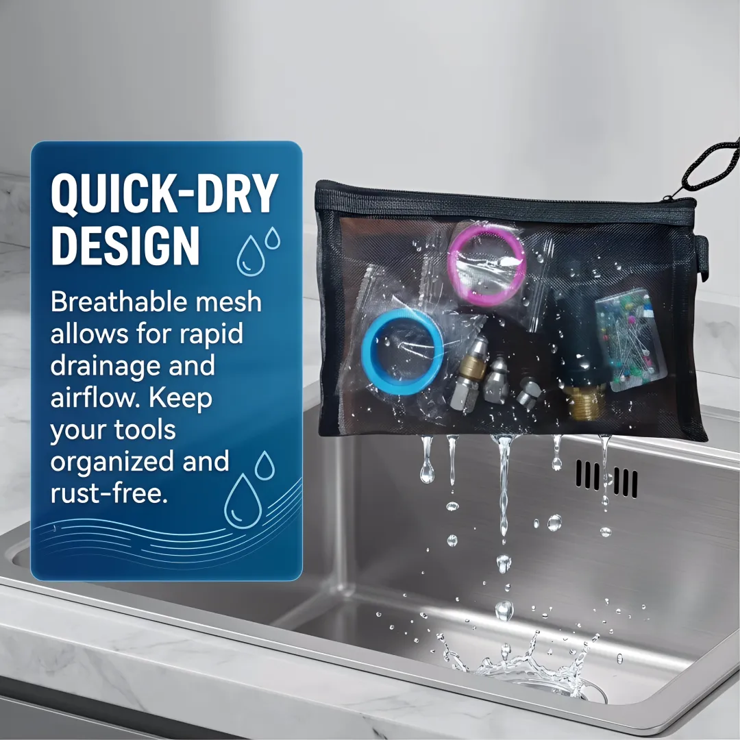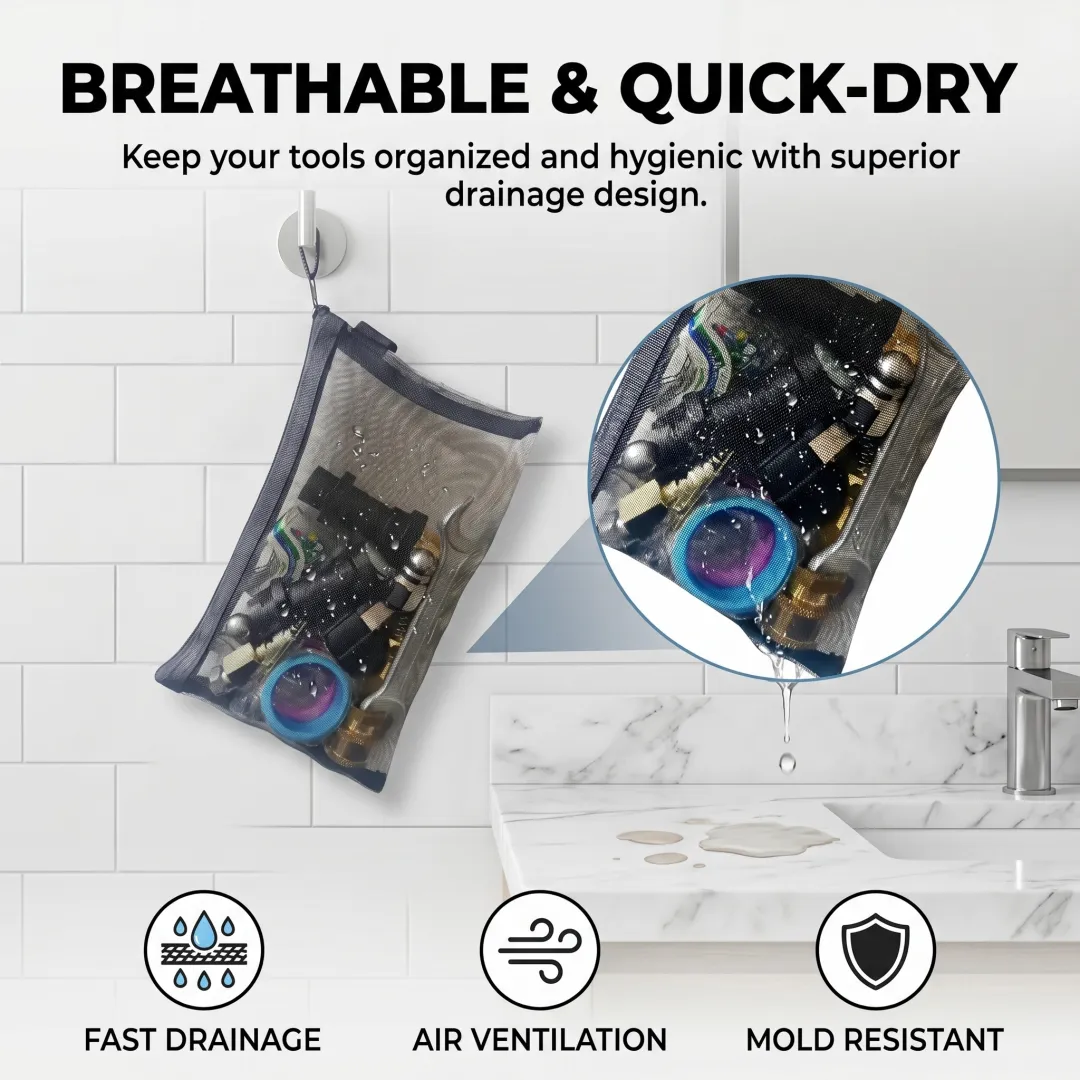 上传了一个产品图,给个提示词:这是一个网纱收纳袋,里面装满管道清洗配件,生成一张场景图,体现网纱袋滤水作用,湿湿的配件放进去,水滴可以流出来,自然风干
