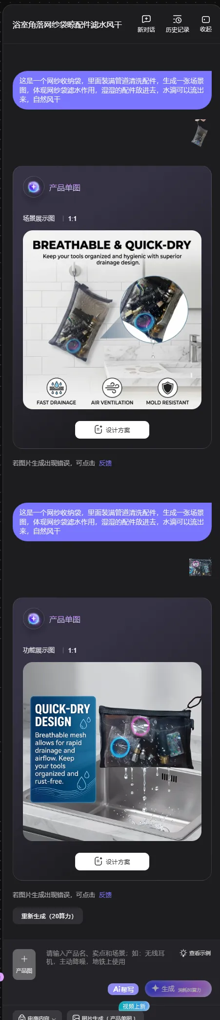 从目前来看,这款电商AI工具作图是可以达到我们想要的效果的额,在提示词里面,写明想要的效果,或告诉这是个什么产品,有什么作用,他基本上就能按照相关的意思去设计图片了。