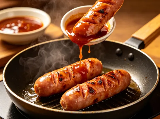 肠身划几刀,用平底锅煎到外皮微焦,趁热裹满酱汁,肉汁混着鲜辣在嘴里爆开,一口就是烧烤摊级快乐!