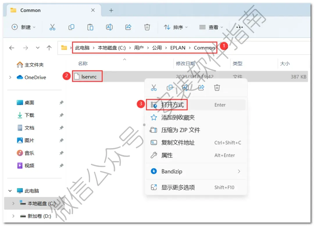 25、打开目录:此电脑\本地磁盘(C:)\用户\公用\EPLAN\Common,找到并选中【Iservrc】文件,右键点击【打开方式】