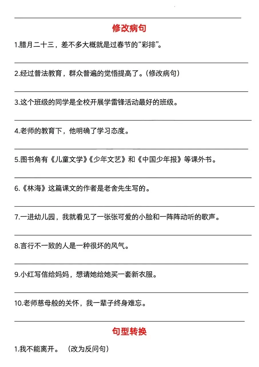 聚焦双重否定句、修辞手法、缩句、修改病句、句型转换、仿写六大必考句型,题型典型、针对性强,适合期中句型专项复习与巩固。