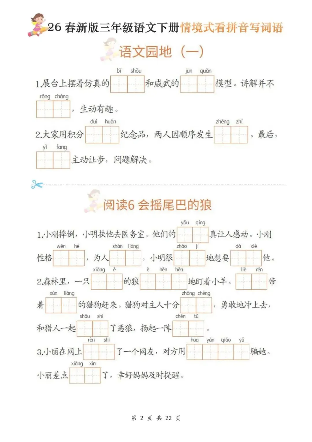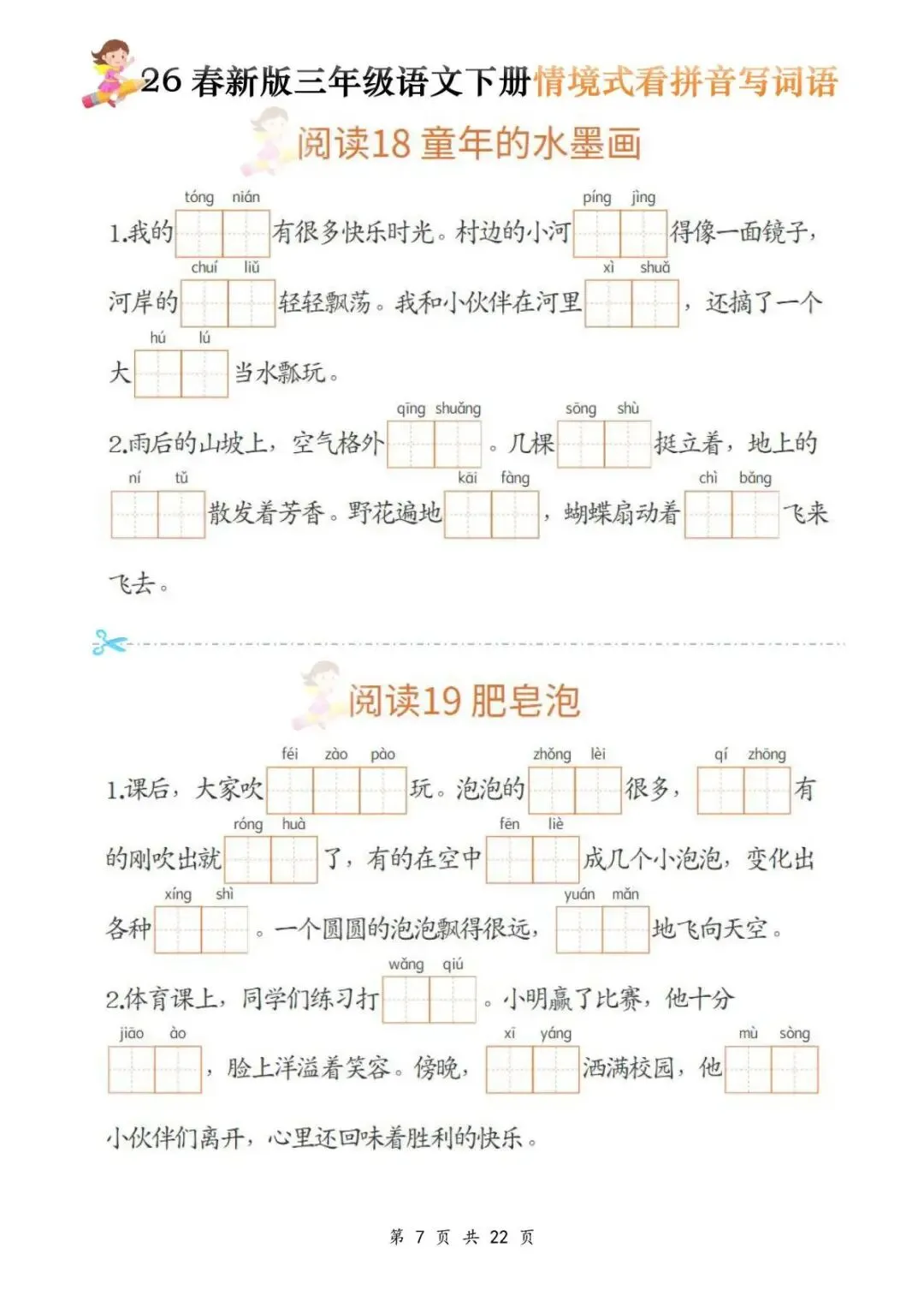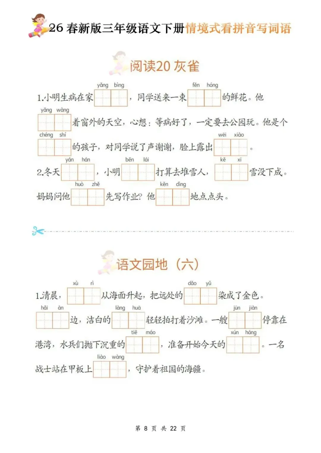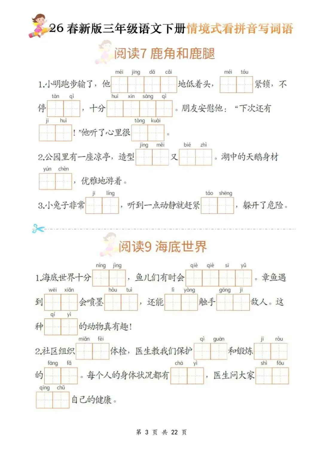 今天给大家分享的是:三年级(下)语文《看拼音写词语》,共22页,电子版可下载打印。文章末尾可直接领取全套电子版,无套路,欢迎收藏和下载。如果觉得这份资料不错,建议分享到班级群/年级群,让其他家长打印出来,帮助孩子学习;如果觉得合适,请支持正版!