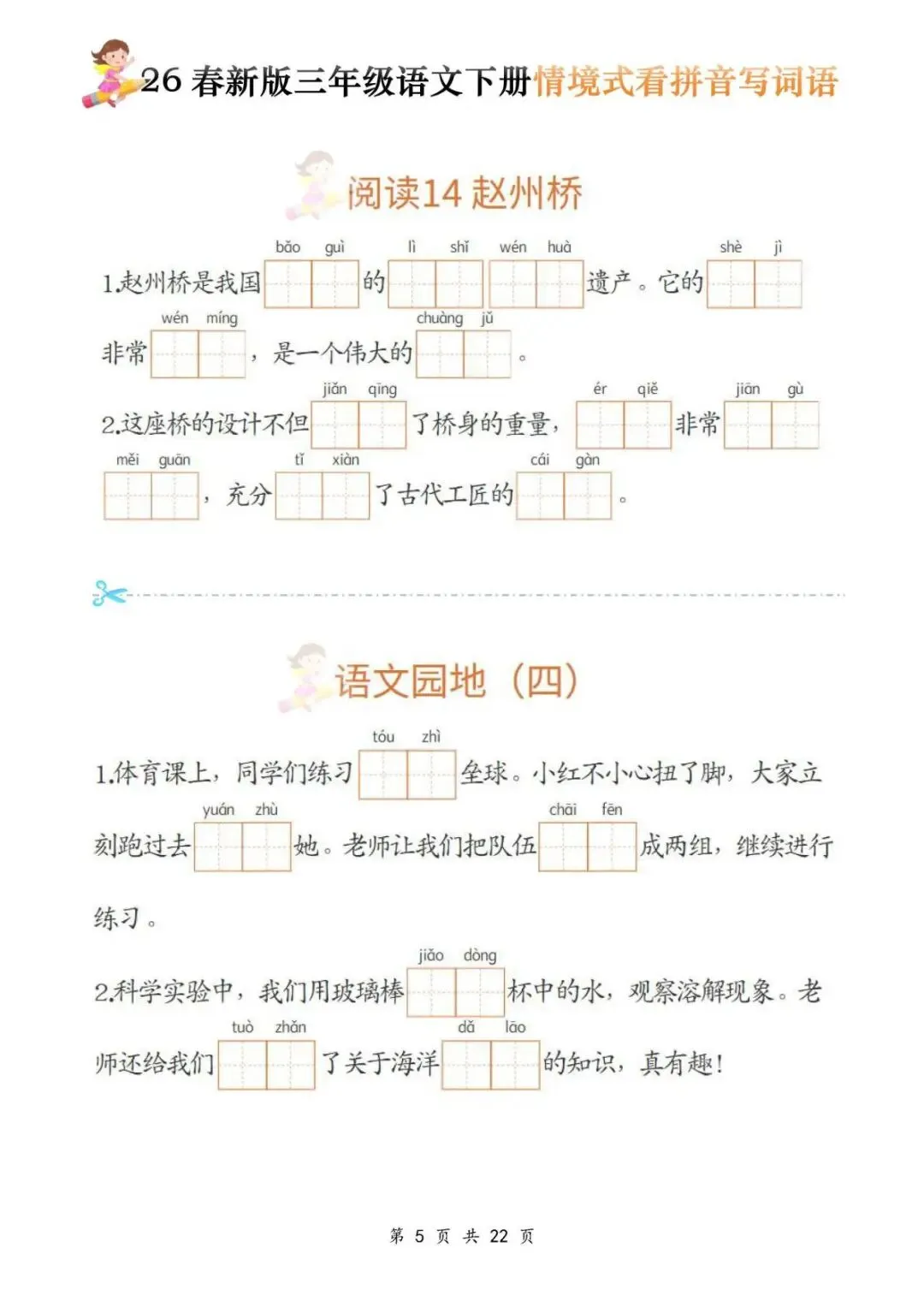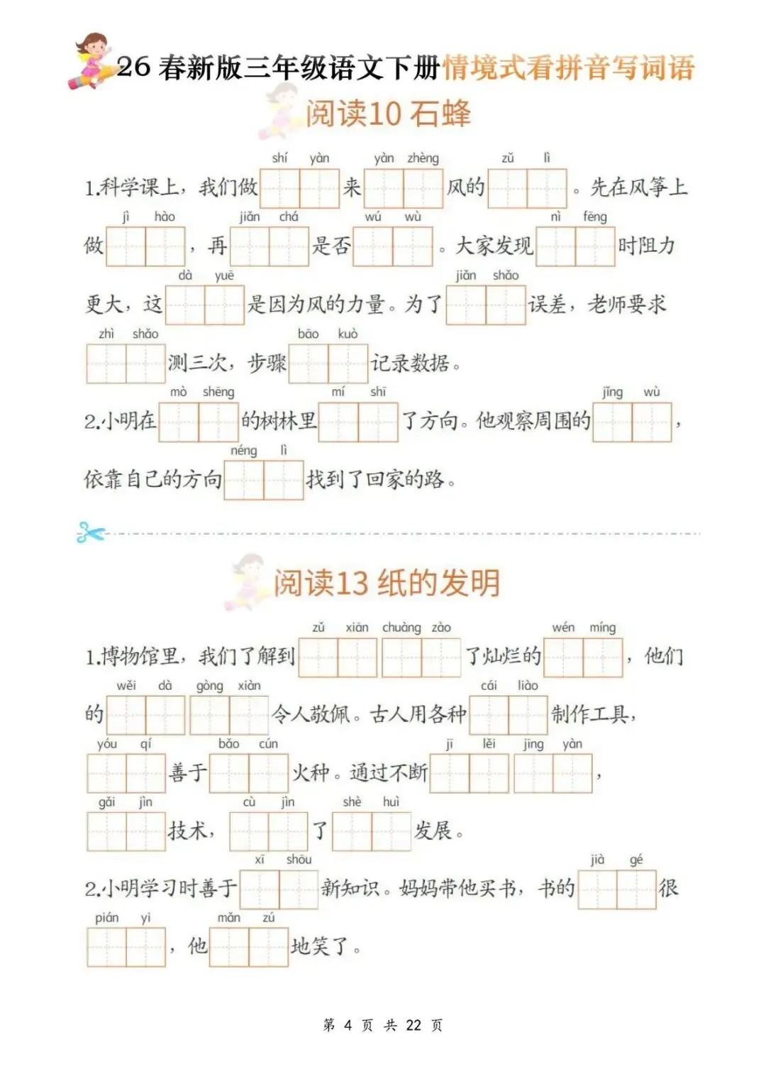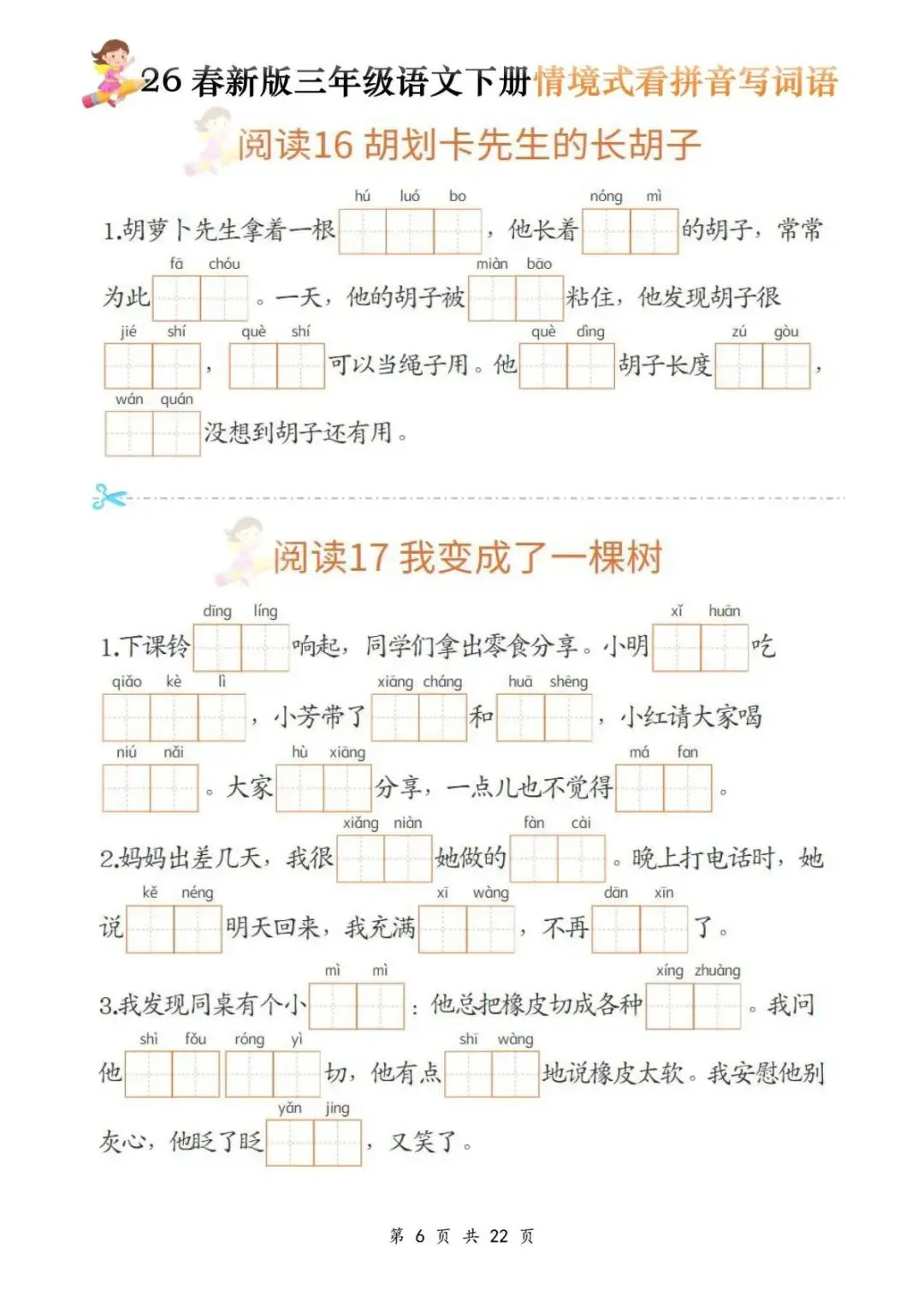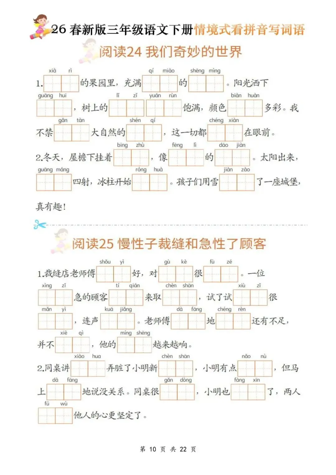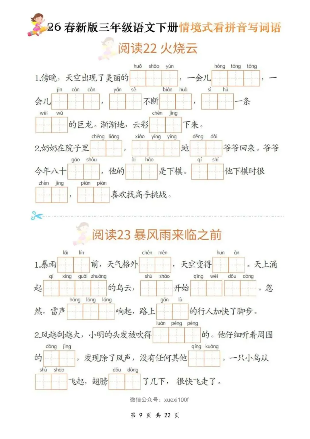 今天给大家分享的是:三年级(下)语文《看拼音写词语》,共22页,电子版可下载打印。文章末尾可直接领取全套电子版,无套路,欢迎收藏和下载。如果觉得这份资料不错,建议分享到班级群/年级群,让其他家长打印出来,帮助孩子学习;如果觉得合适,请支持正版!
