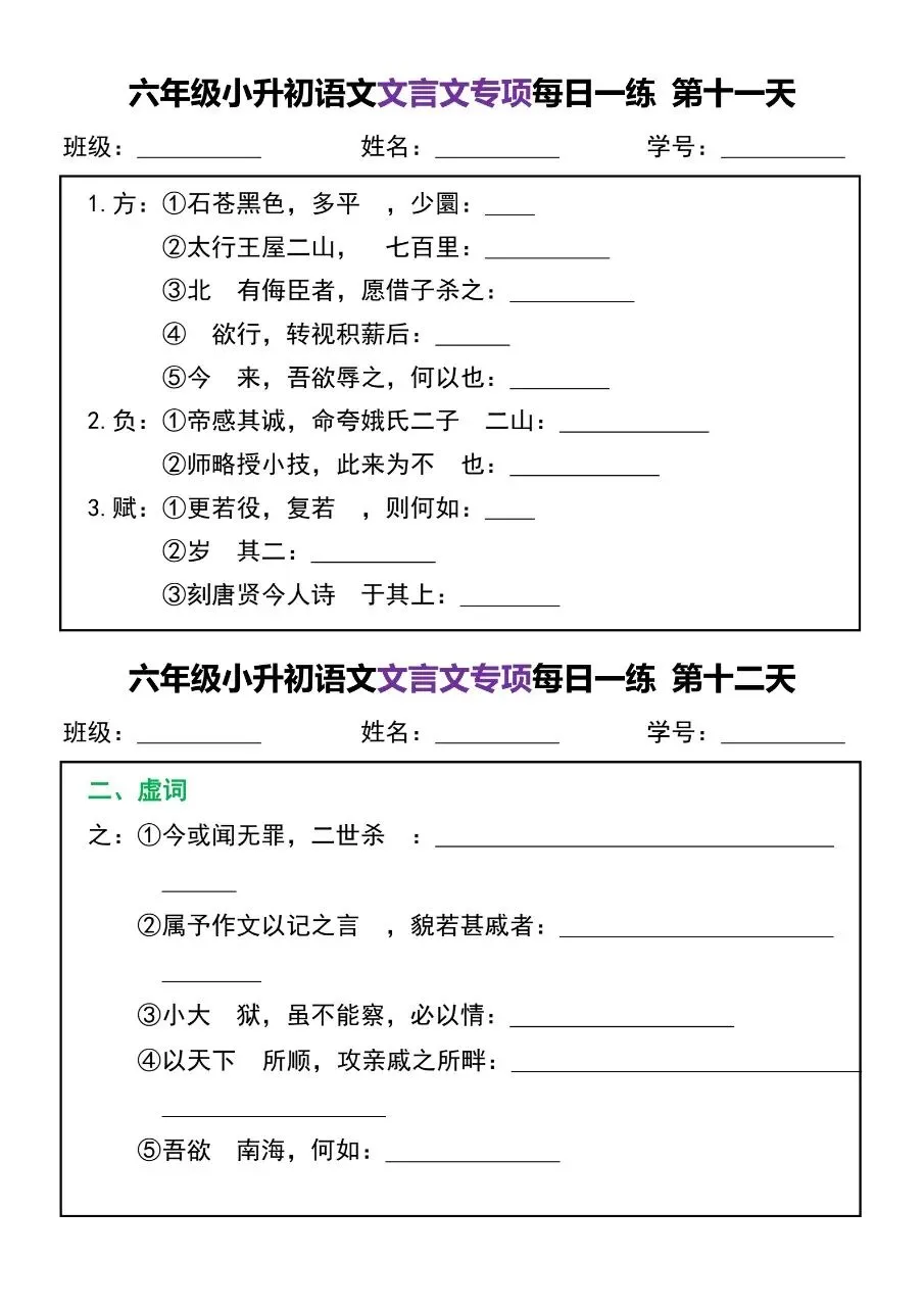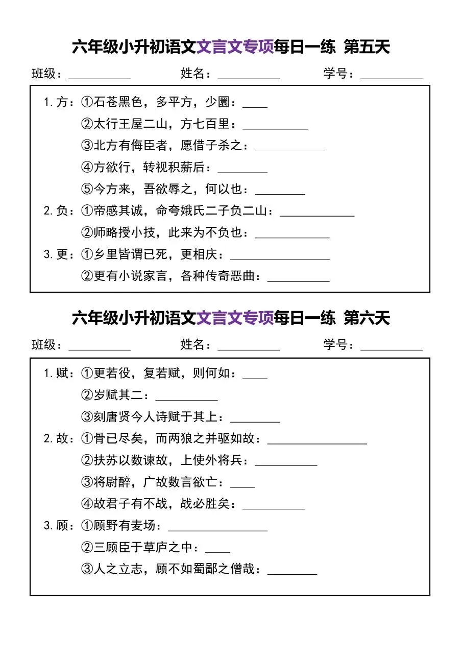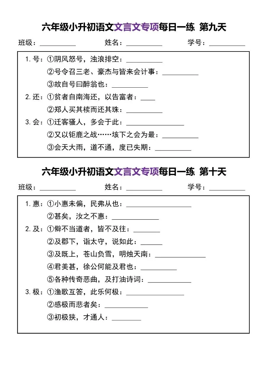 六年级小升初语文文言文专项每日一练电子版免费下载!