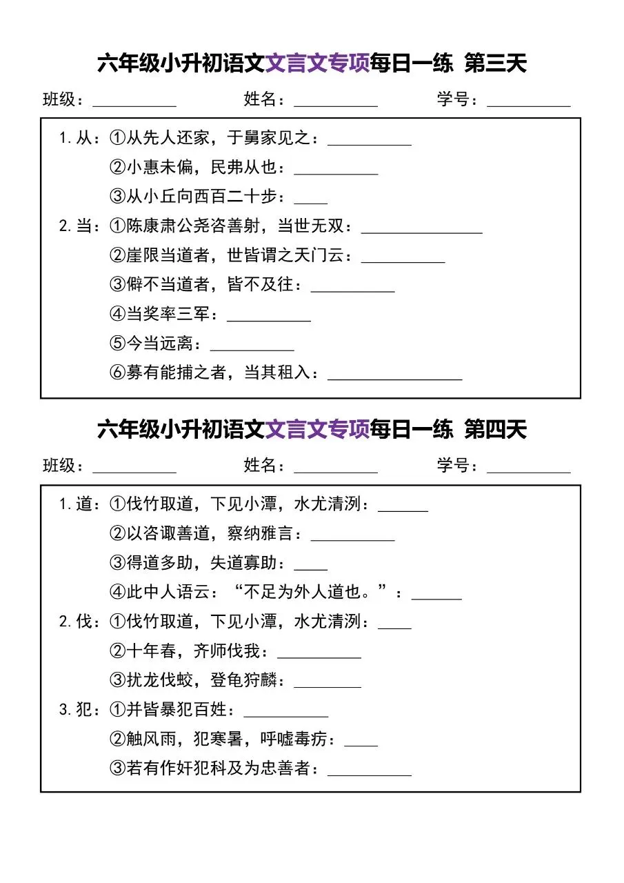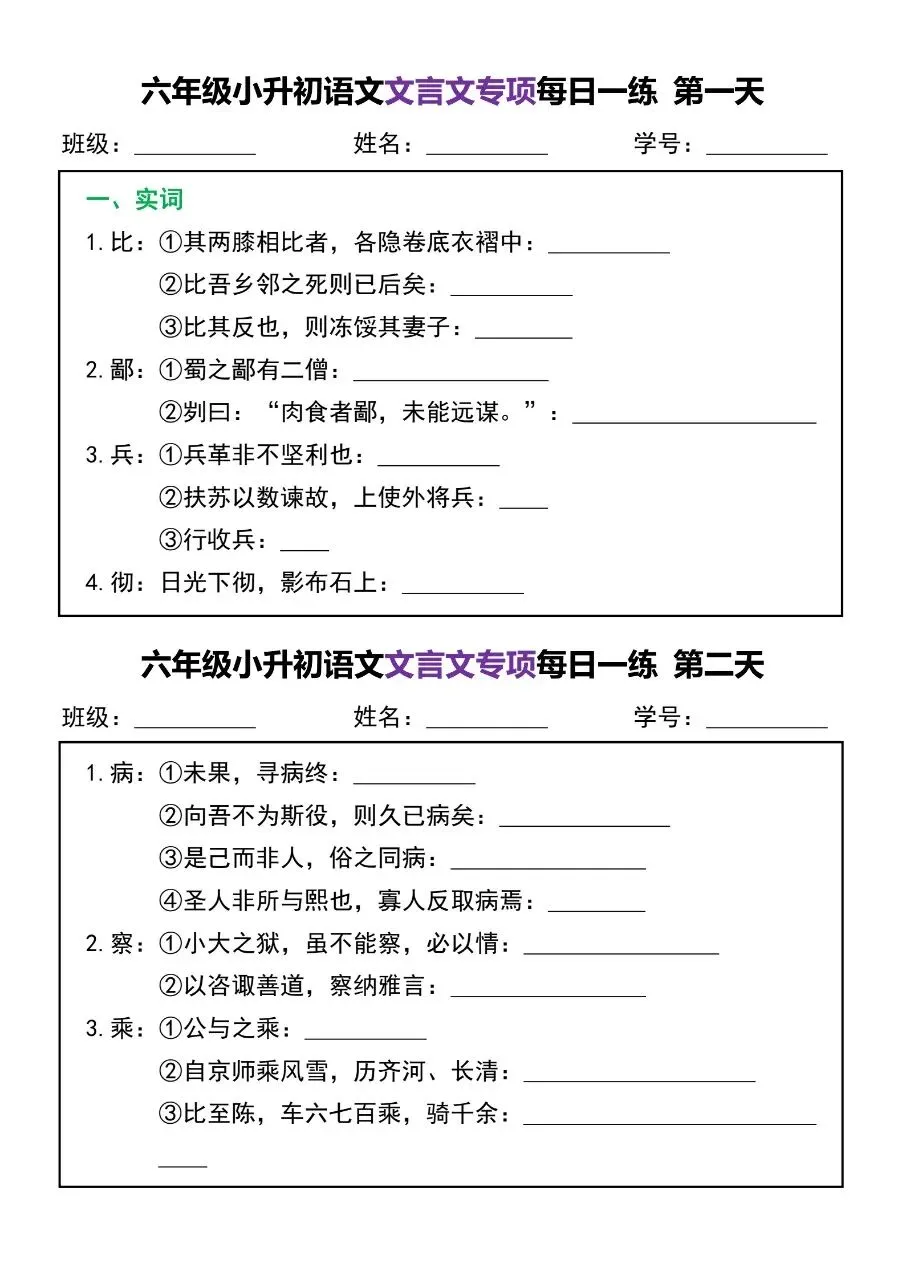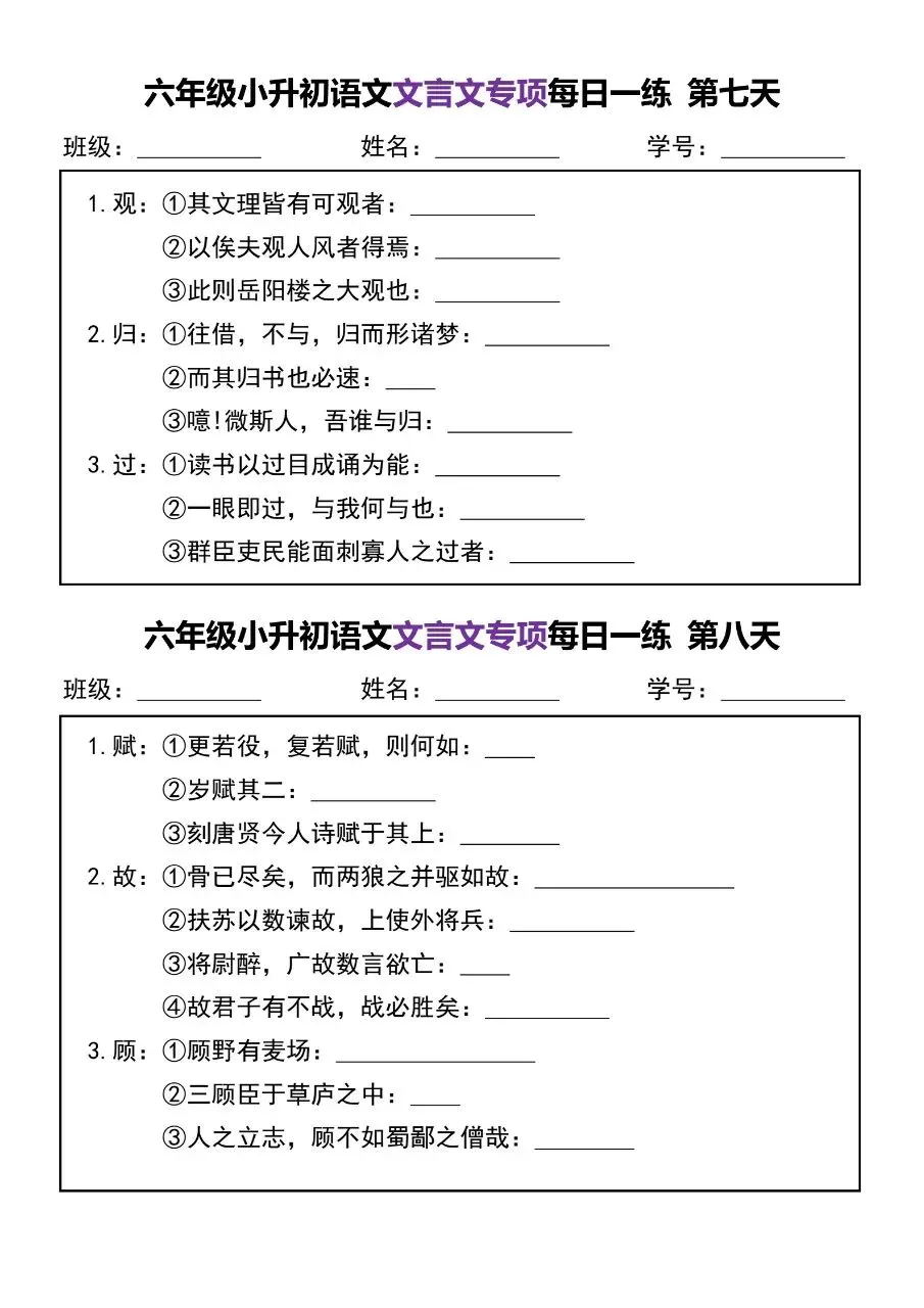 六年级小升初语文文言文专项每日一练电子版免费下载!