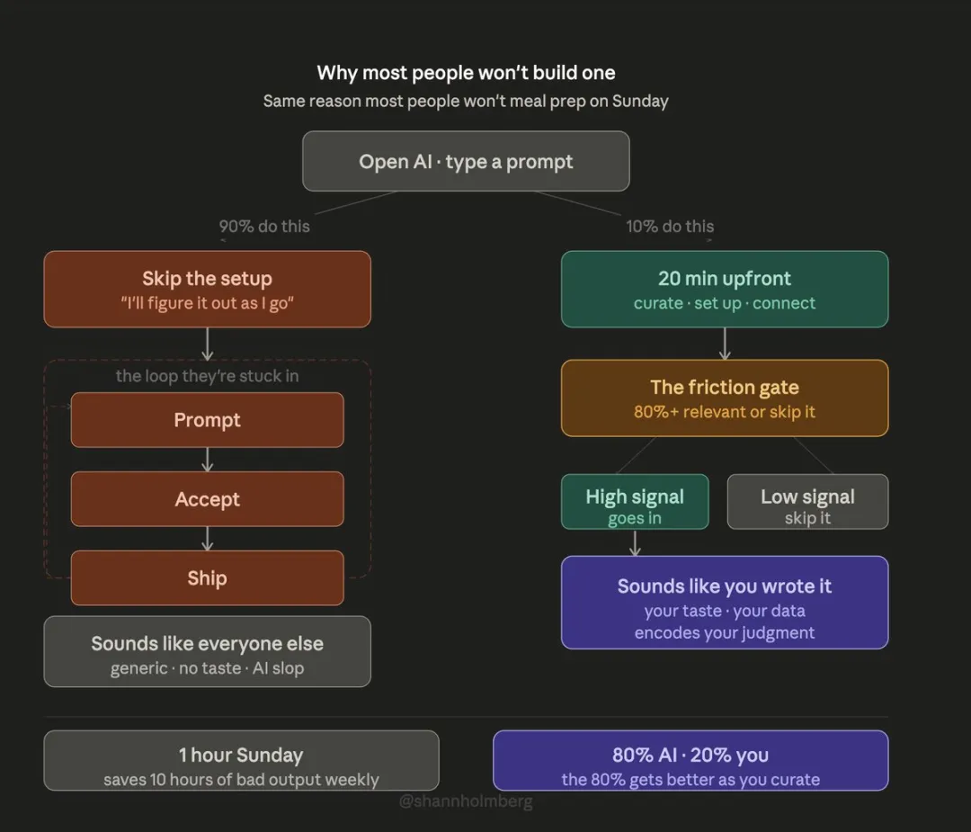 搭建这套系统并不存在极高的技术门槛,真正的挑战在于“认知懒惰”。这就像很多人深知“周日备餐”能为忙碌的一周节省大量时间,却很少有人付诸行动。大多数用户更习惯于写一段提示词,接受一个平庸的结果,然后直接发布。这种“快餐式”的AI协作模式,最终会导致内容的同质化竞争。