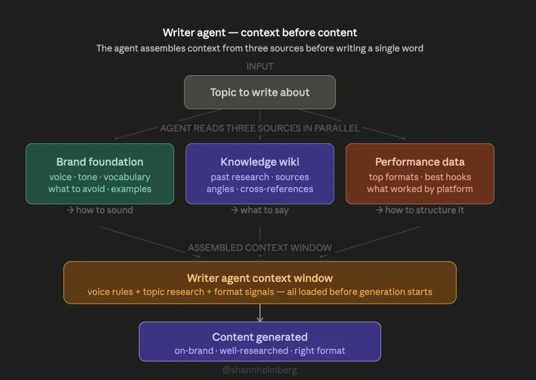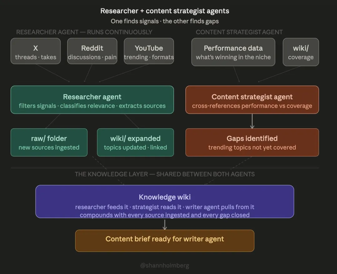 知识库层(Knowledge Base Layer)是一个持续进化的动态系统。它的核心逻辑是将零散的原始素材——包括但不限于阅读笔记、行业观察、推文、书签、PDF文档以及语音备忘录——转化为结构化的数据资产。AI智能体在这里扮演了“图书管理员”的角色: