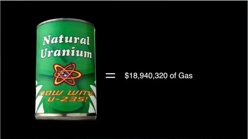 这件事很有意思。想象一下,如果你有一个罐头大小的容器,里面装满了贫铀。就这么一小罐东西,它所蕴含的能量,足够供你和你的整个家庭,用上一辈子。一辈子。就一罐废料而已。