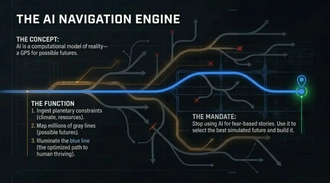 那些灰色的线,代表着你的“可能的未来”,是去上班的其他路径。也许你中途想去趟星巴克。AI的真正用途,就是为我们、为我们的世界、为我们关心的事物创建这些计算模型,然后向我们展示:“看,这些是你的可能未来。选一个吧。”