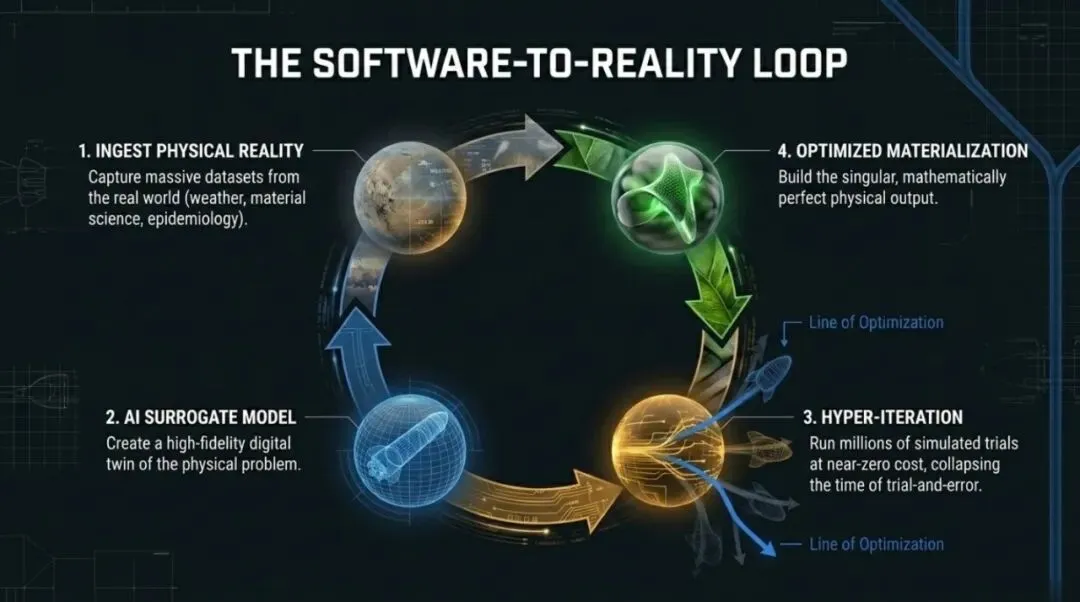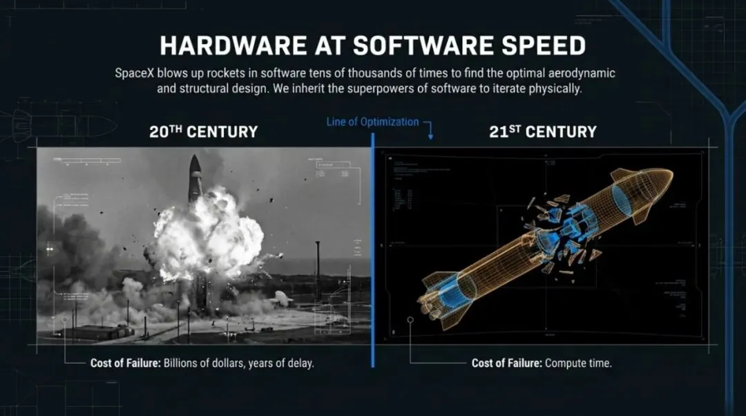 当你设计一架高超音速喷气机、一枚火箭或一辆特斯拉时,你是在软件中设计它,在软件中测试它,在软件中让它坠毁。你成千上万次地重复这个过程,直到你确切地知道什么才是最佳设计。然后,你才去制造那唯一的一个实体。