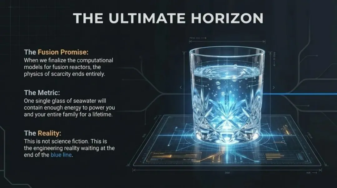 我们最终会弄明白如何让这些聚变反应堆工作起来。而一旦我们做到了,一杯海水中的氘就足以供一个家庭使用一辈子。这就是即将到来的未来。