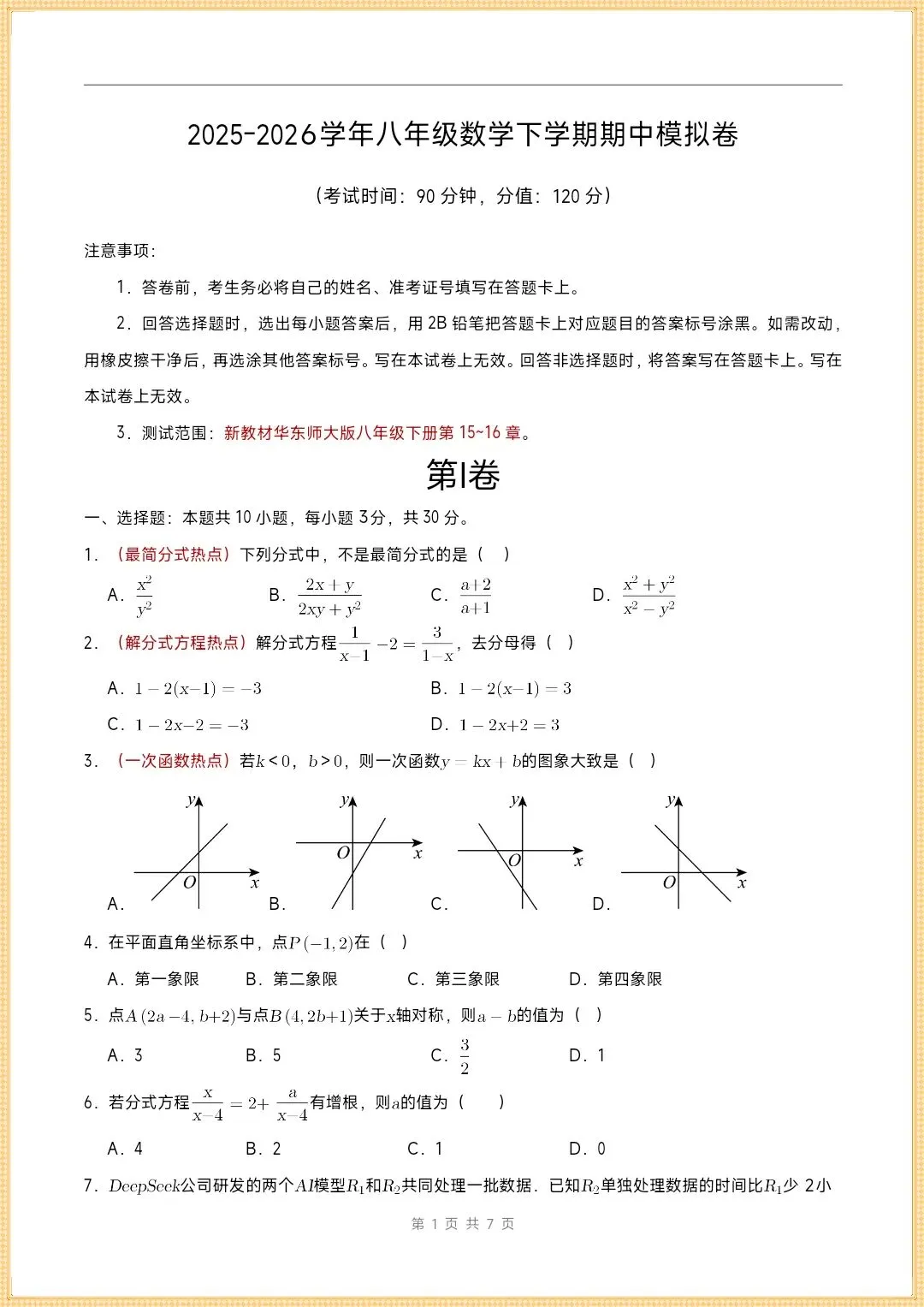 2025-2026学年八下数学(华师版)《期中测试卷(共4份)》,有完整电子版(原卷版+解析版)
