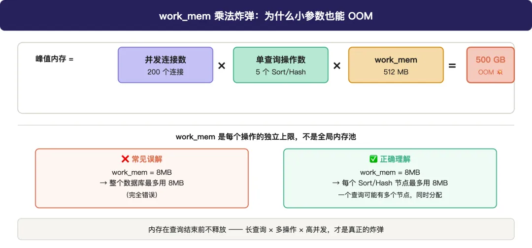 200 个并发连接,每个查询有 5 个 Sort/Hash 节点,work_mem=512MB,理论峰值 = 500GB。没有服务器能顶住这个。