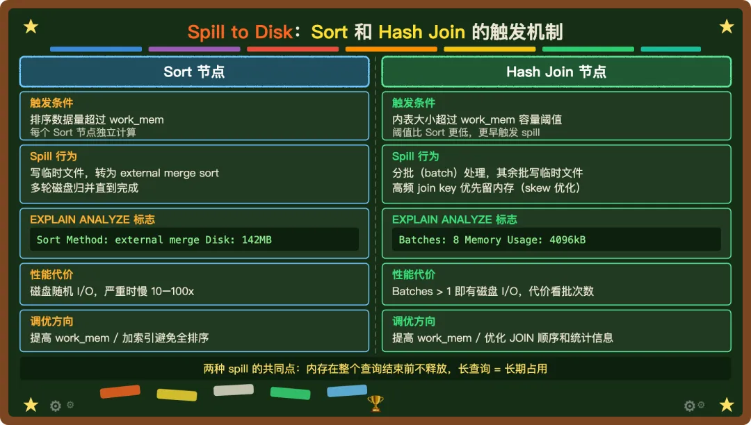 Spill 的代价是磁盘 I/O,不是查询失败,所以很容易被忽视。等到业务反馈”查询变慢了”,临时文件可能已经堆了几十 GB。