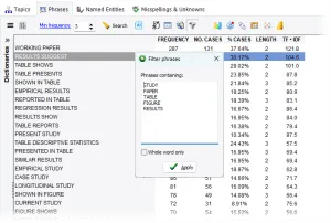 短语过滤器现支持匹配多个文本表达式。例如,用户可检索包含“表”、“结果”、“数据”或“图”任一术语的所有短语。此功能有助于短语组的审查与整合,从而提高词汇或概念组织任务的效率。