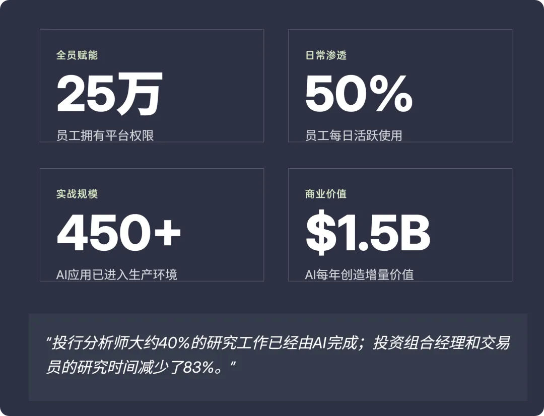 这些数字已经够惊人了,但真正让我觉得“游戏规则变了”的是另外几个数据:投行分析师大约40%的研究工作已经由AI完成;投资组合经理和交易员的研究时间减少了83%。83%——这意味着以前一个交易员花5个小时做的研究,现在不到1个小时。