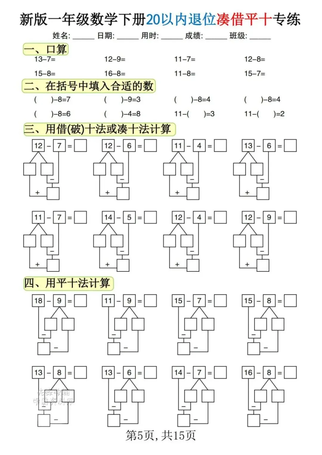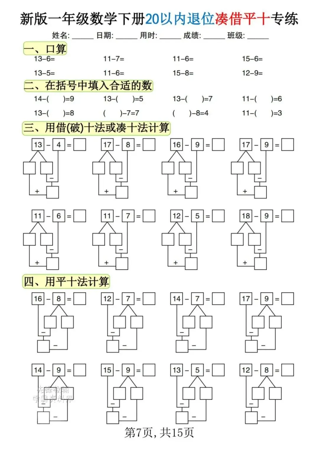 一年级|2026春一下《数学退位练习》,电子版可下载可打印