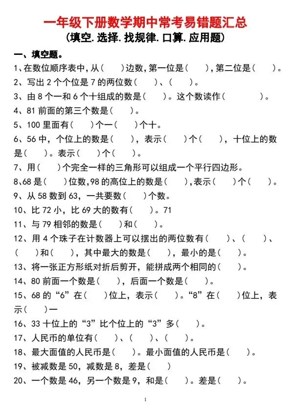今日分享一年级下册数学期中常考易错题汇总(完整电子版可打印)!高清电子版可直接打印,排版规整适配练习,不用费心整理,孩子每日一练夯实基础,家长辅导省心!