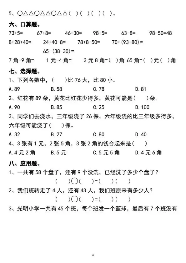 一年级下册数学期中常考易错题汇总(完整电子版可打印)