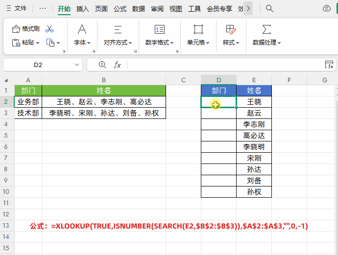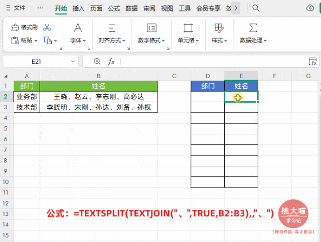 如下图所示,需要将左侧表格(公司部门 + 用顿号间隔的混合姓名)转换为右侧拆分后的表格(每个部门下,每位员工单独占一行)。