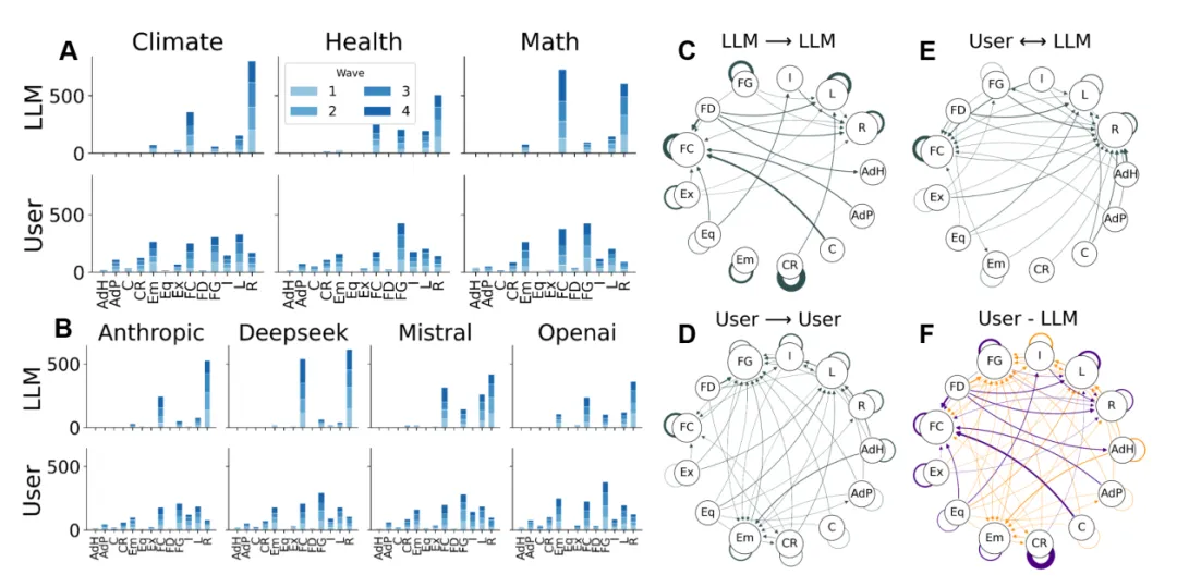 图3:(A-B)按主题(A)和LLM(B)分组的俏皮话中谬误的频率分布。(C-D)四个聚合波中的谬误转换模式,显示了(C)LLM和(D)用户如何在不同的谬误类型之间移动。(E)组合谬误转换(用户→ LLM → User → …)在连续的俏皮话中。(F) 用户和LLM转换概率的差异:紫边表示LLM的概率更高;橙色边缘,供用户使用。节点大小与成比例,单位为度。谬误传说——AdH:Ad Hominem;AdP:Ad Populum;C:信誉;CR:循环推理;Em:诉诸情感;Eq:等效;例如:扩展;FC:虚假因果关系;FD:虚假困境;FG:错误的泛化;I:有意;L:逻辑;R:相关性。