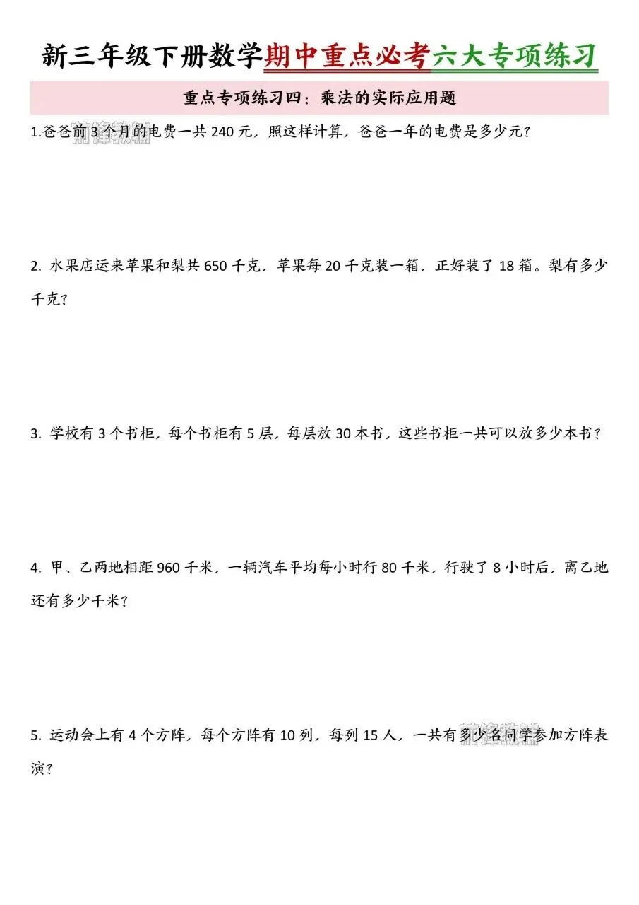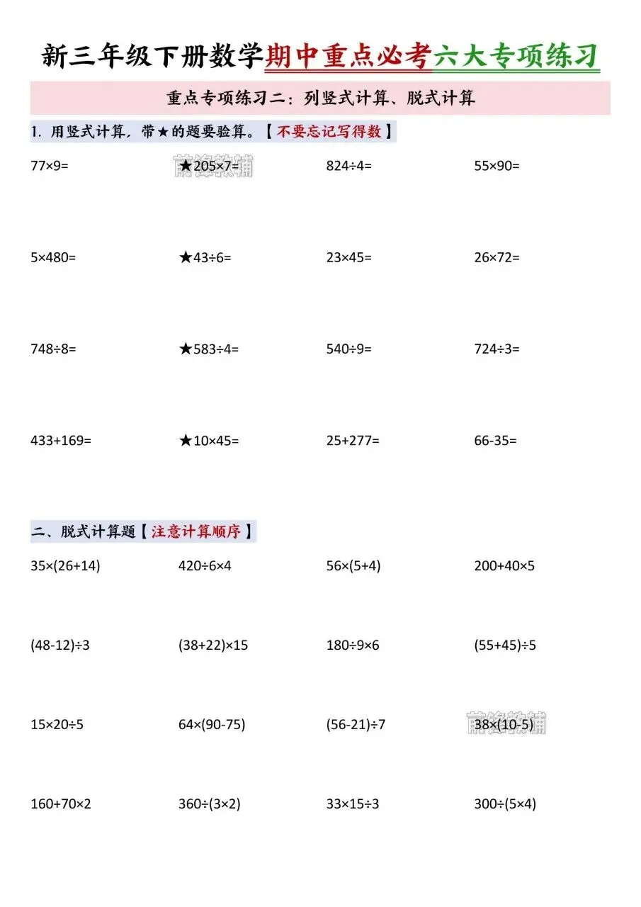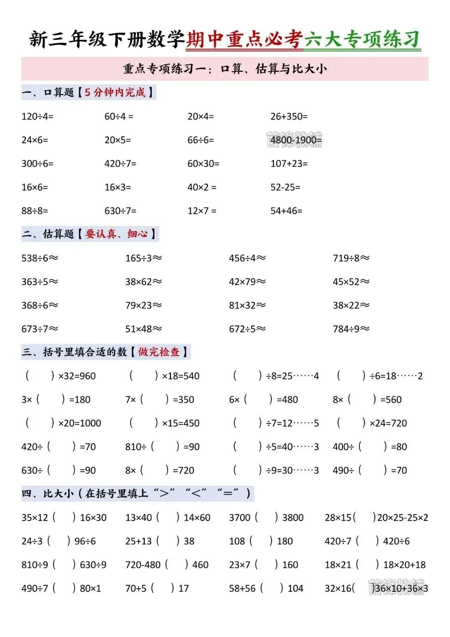 新三年级下册数学期中重点必考六大专项练习电子版免费下载!