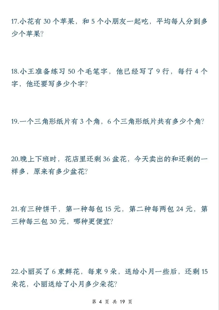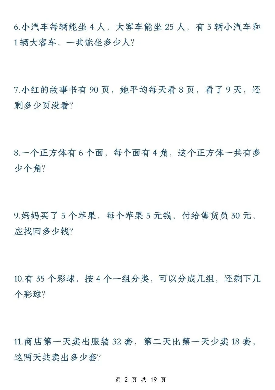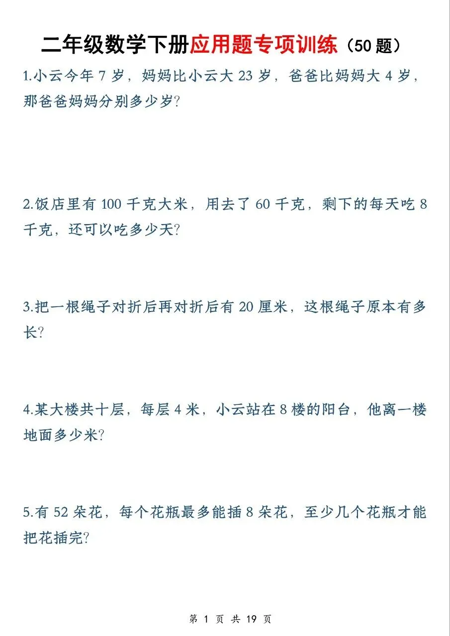 二年级数学下册应用题专项训练(50 题)电子版免费下载!