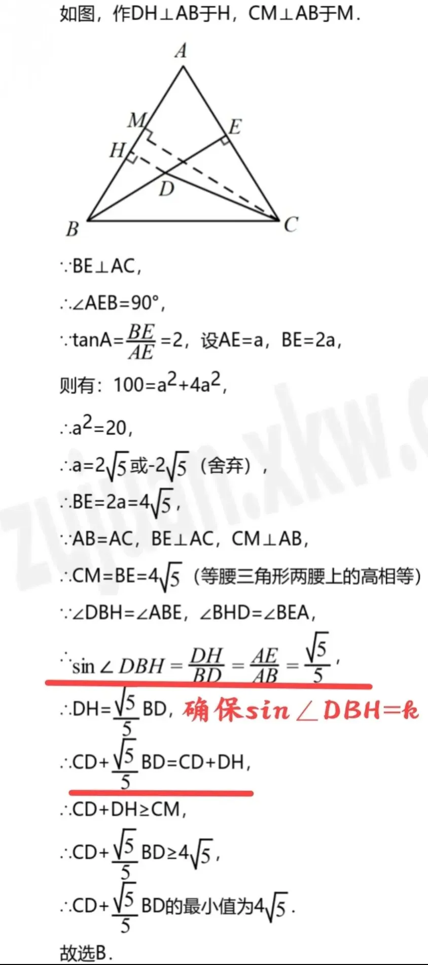 ② 构造垂线:根据该三角函数值,通过作垂线,将加权的线段转化为一条垂线段的长度。(如何一拿到题就能画出正确的图很关键,请细细琢磨)
