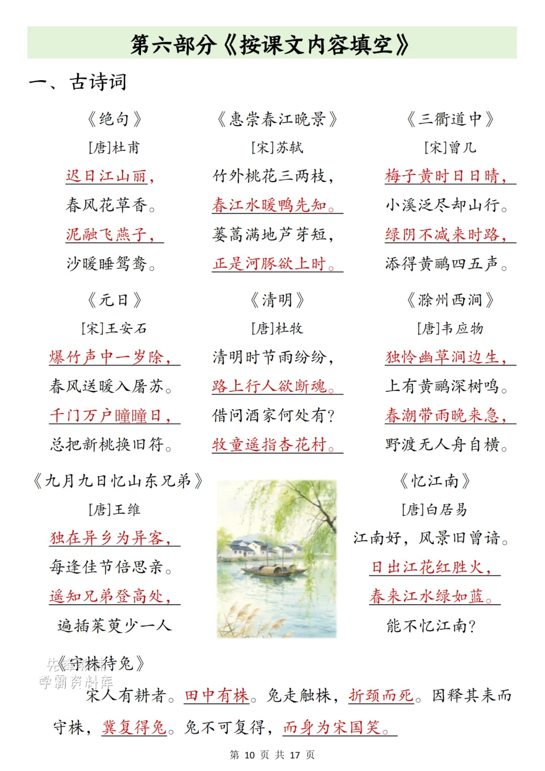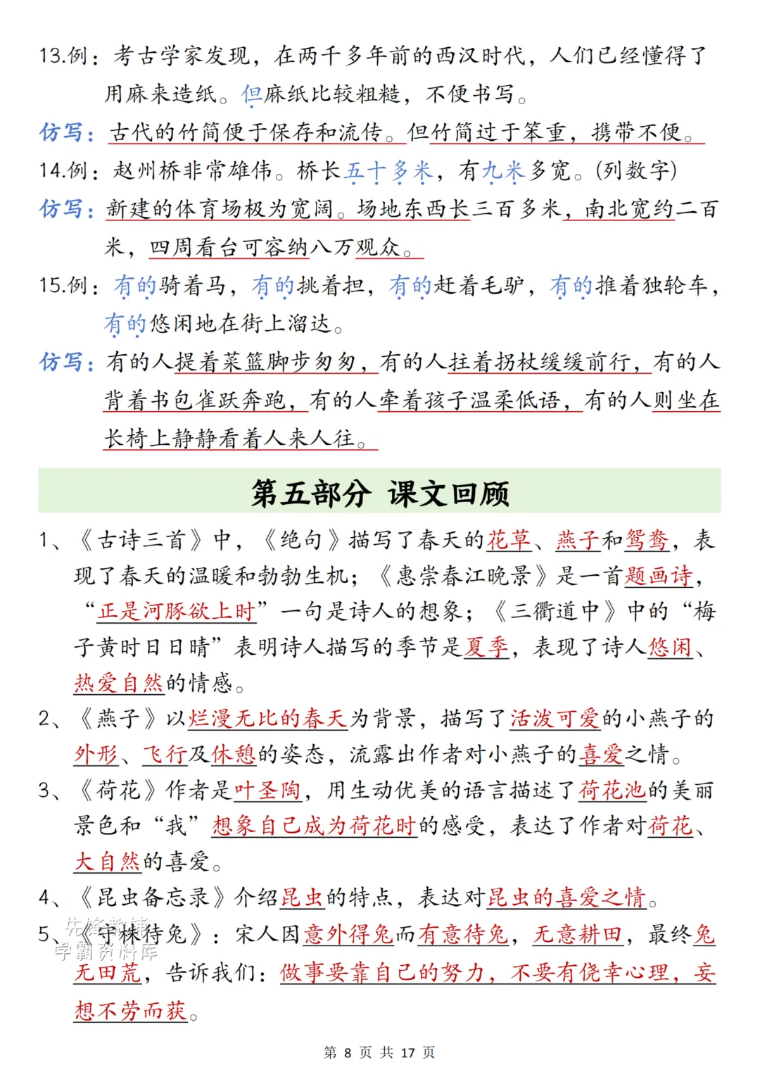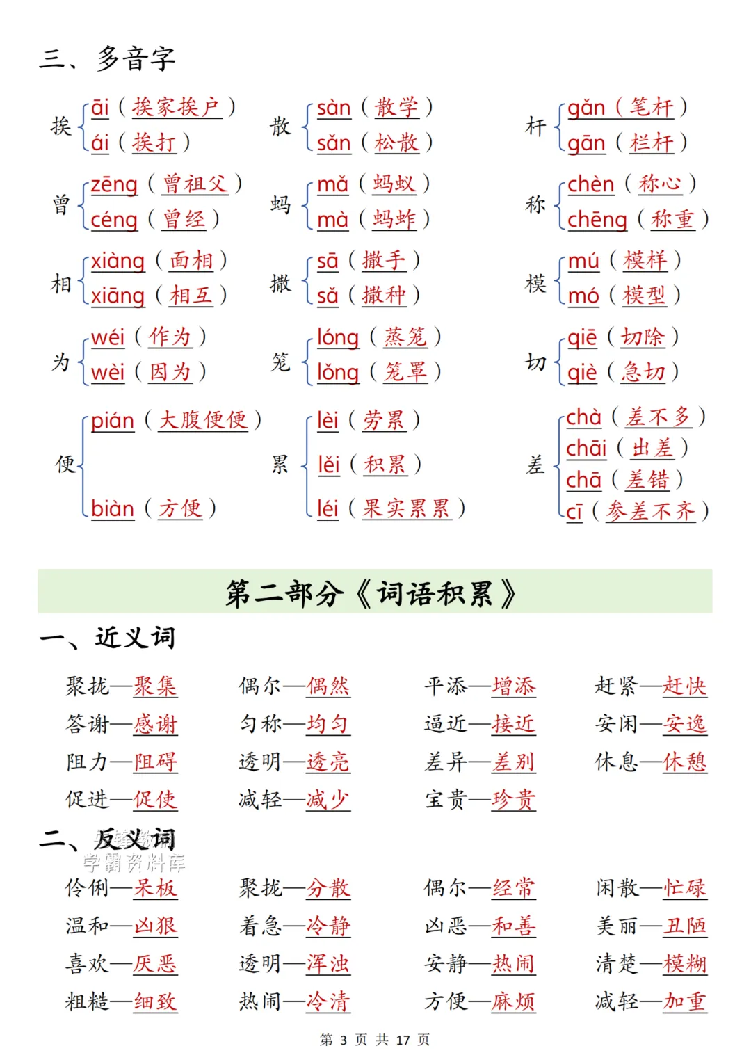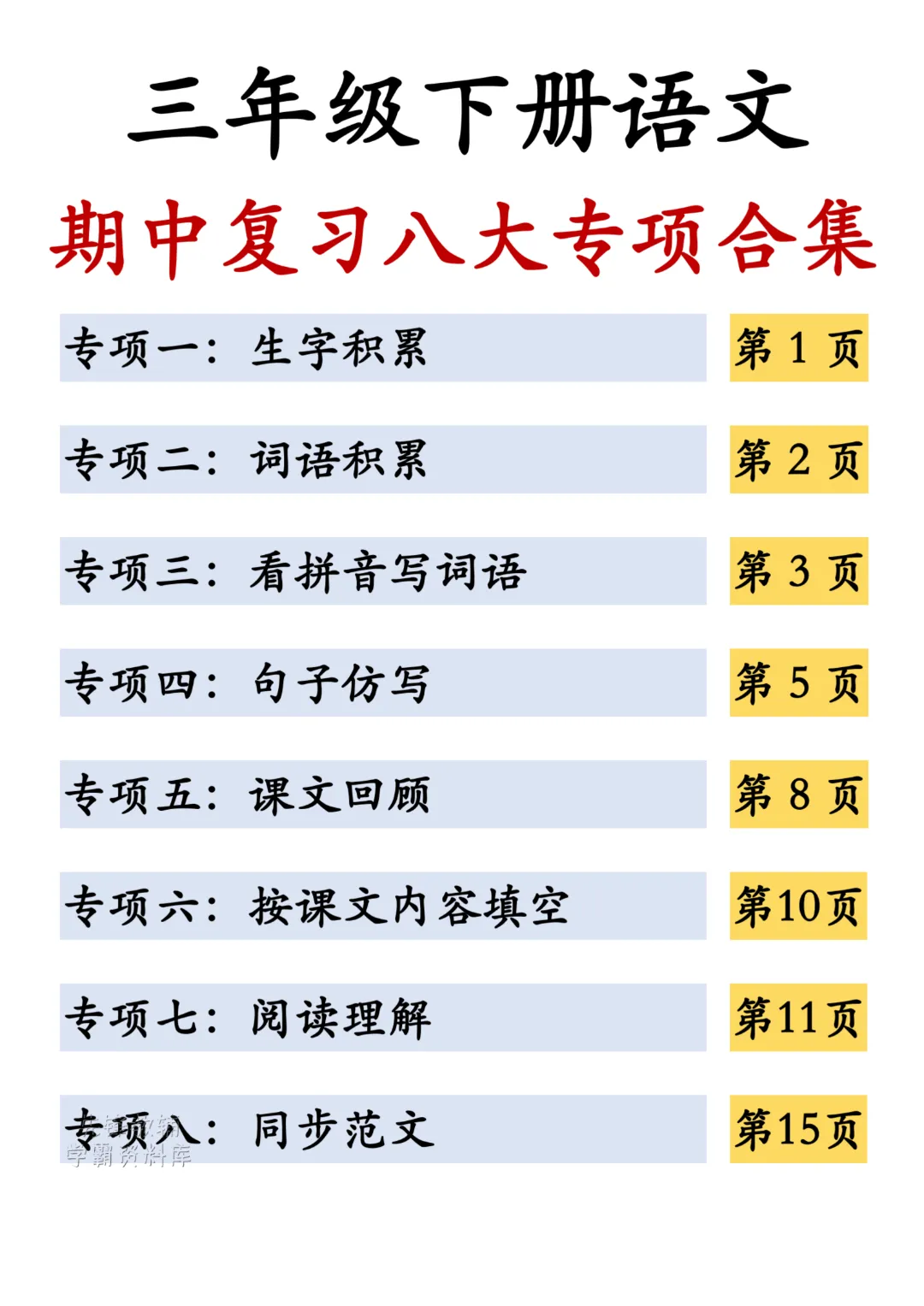 26春三年级下册语文《期中复习八大专项》共17页,电子版可下载打印。三年级语文期中复习的宝藏资料来啦!从生字词语、课文基础到句子仿写、阅读理解,还有同步范文参考,八大专项全覆盖,帮孩子高效梳理考点,轻松跨过学习分水岭~!需要的家长抓紧帮孩子打印出来每天背记一下吧