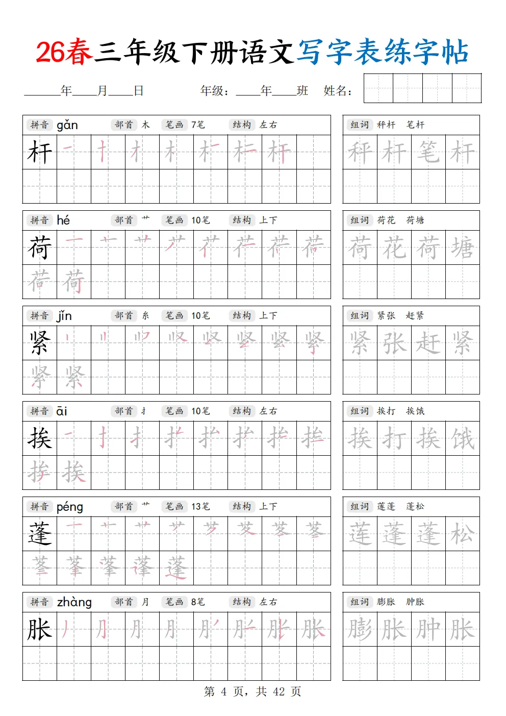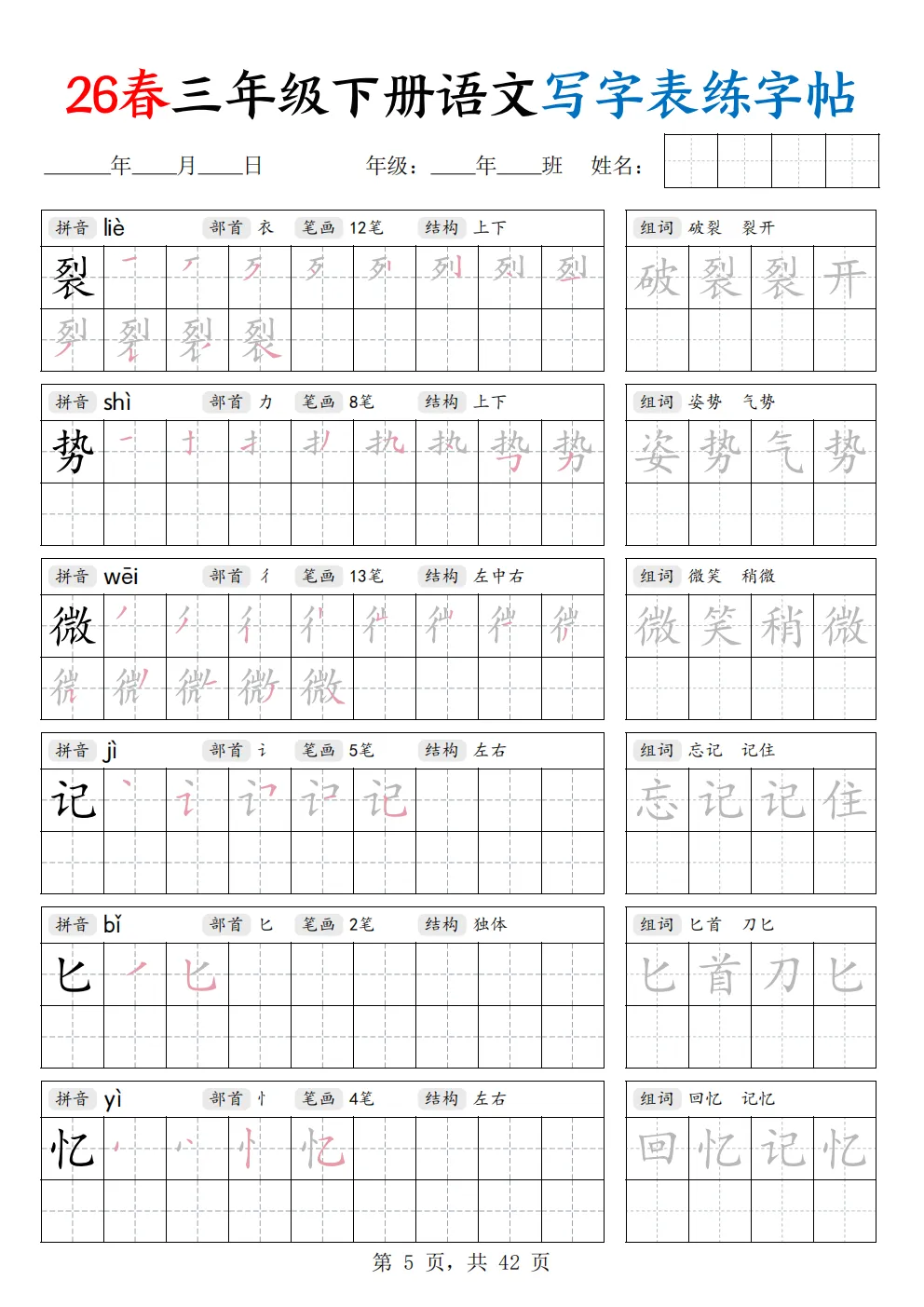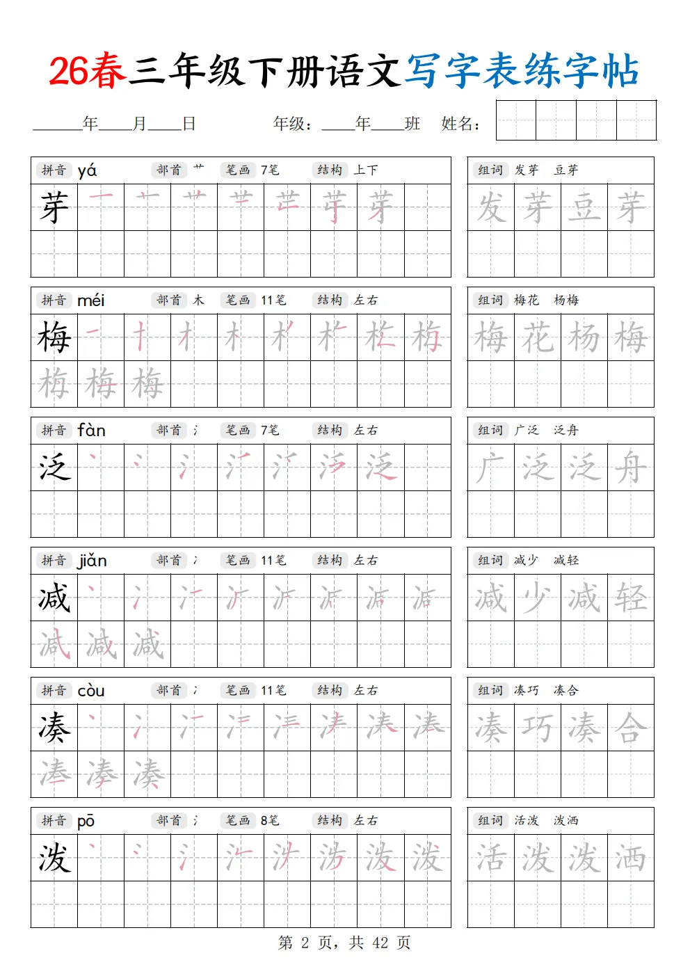 26年新三年级下册语文《写字表练字帖》共42页,电子版可打印,这份字帖同步新版课本写字表生字,笔顺规范、田字格标准,贴合课内要求。规范汉字书写、纠正潦草字迹,同步巩固生字记忆,把普通的描红字帖分成了拼音、部首、笔画数、间架结构这四个内容,让孩子在练字的时候关注汉字的间架结构,这是写好字的关键,右边还有组词练习,在练习的同时还能积累词语,有需要的家长可以打印出来,让孩子练一练哦。