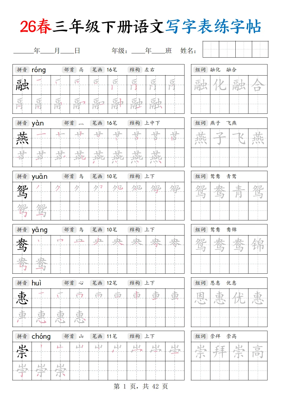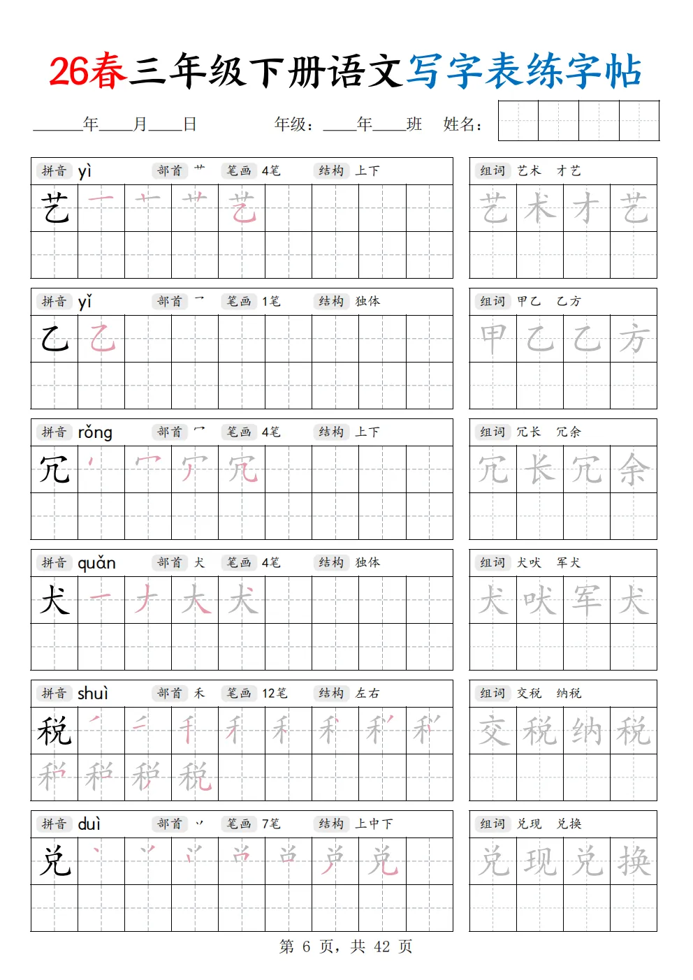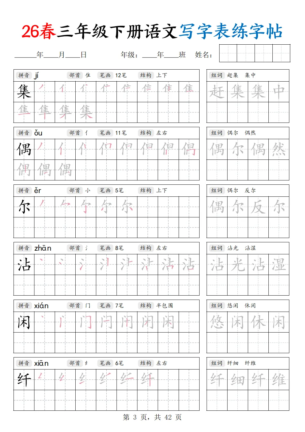 26年新三年级下册语文《写字表练字帖》共42页,电子版可打印,这份字帖同步新版课本写字表生字,笔顺规范、田字格标准,贴合课内要求。规范汉字书写、纠正潦草字迹,同步巩固生字记忆,把普通的描红字帖分成了拼音、部首、笔画数、间架结构这四个内容,让孩子在练字的时候关注汉字的间架结构,这是写好字的关键,右边还有组词练习,在练习的同时还能积累词语,有需要的家长可以打印出来,让孩子练一练哦。