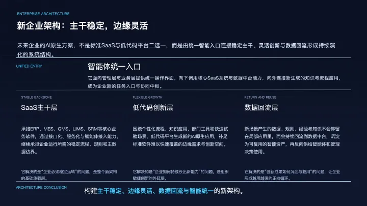 因此,未来真正有竞争力的企业方案,既不是完全依赖标准SaaS,也不是完全押注低代码,而是形成“主干稳定、边缘灵活、数据回流、智能统一”的新架构。这才是AI原生企业解决方案最值得期待的方向。