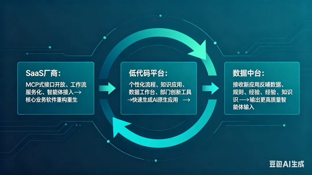 企业架构上,SaaS与低代码将围绕AI分工:SaaS重构业务主干,低代码实现增量创新,数据中台沉淀智能资产,三者形成正向循环,推动企业数字系统动态演进。