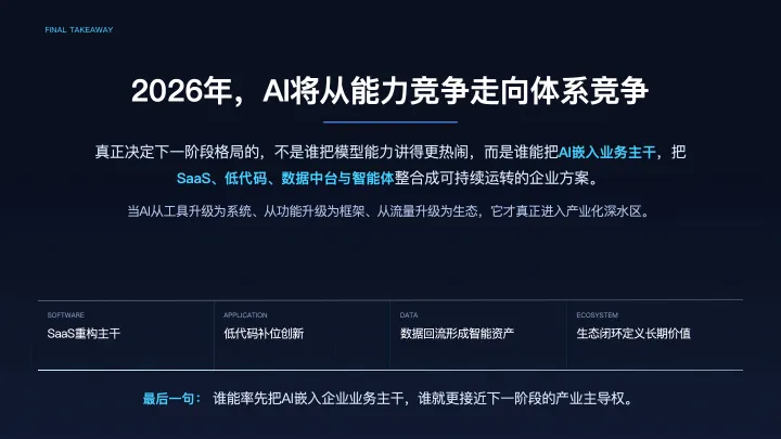 如果要用一句话概括2026年的AI趋势,我更倾向于这样判断:AI行业将从“模型能力竞争”进入“企业体系竞争”。过去行业比的是谁更会生成、谁的参数更大、谁的多模态更强;未来更关键的问题则是,谁能真正把AI放进业务主干,谁能把SaaS、低代码、数据中台和智能体整合成一个可持续运转的企业方案。