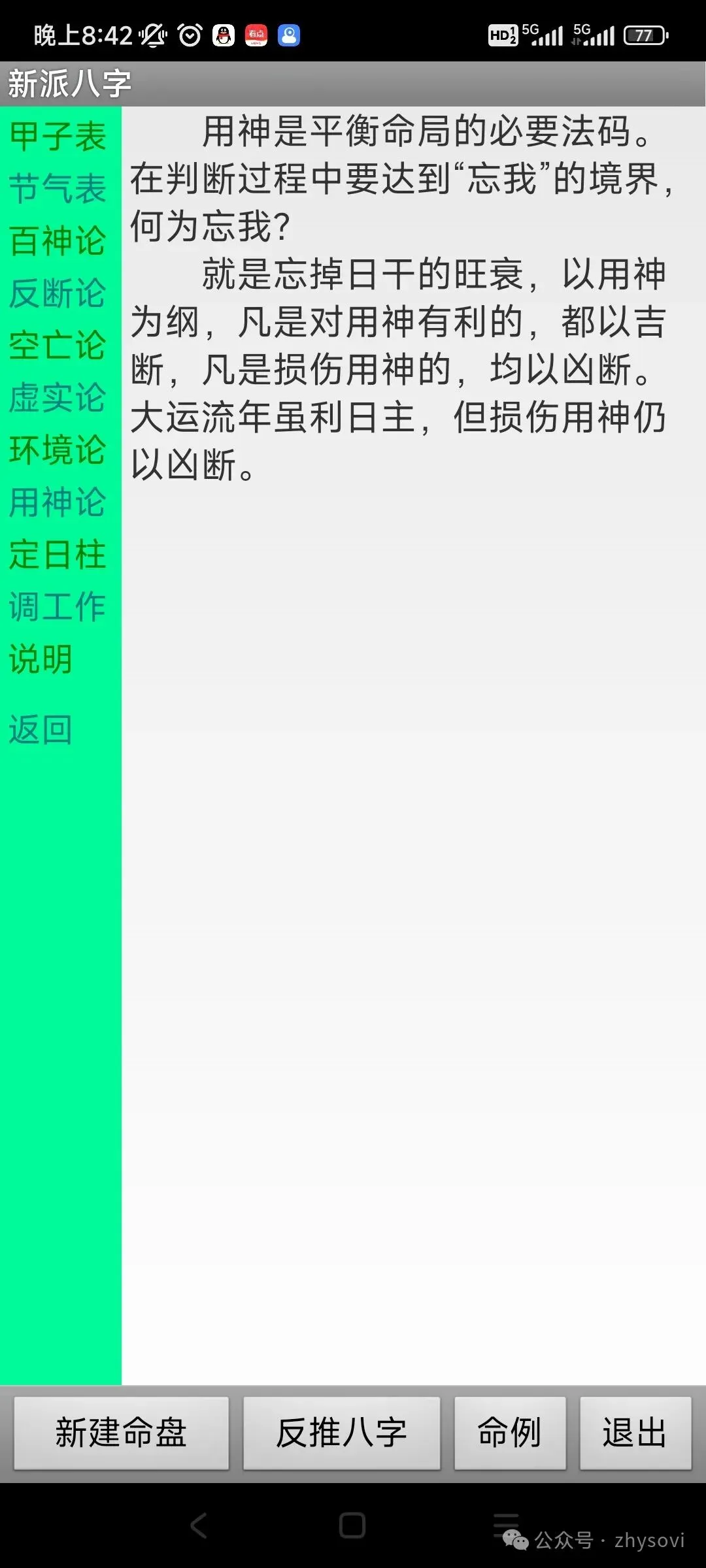 本软件完全依据新派命理的理论技术规范制作完成,包括百神论、反断论、空亡论、体系论、干支分工论、作用关系论等。能自动判断格局强弱,找出用忌神,同时在相应位置用不同的符号标示出来,一目了然。