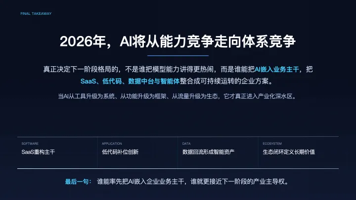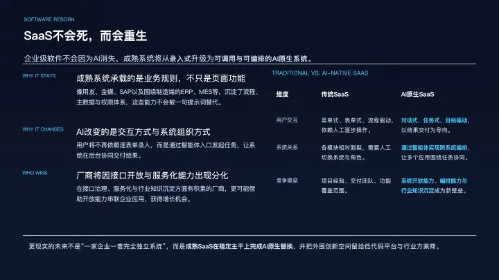 也正因为如此,SaaS不会消失,反而可能在AI时代进入新一轮集中化。原因在于,企业最终仍然需要可复用、可维护、可审计、可持续升级的标准化解决方案。即便AI大幅提升了个性化构建能力,企业也不太可能回到“一家企业做一套完全独立系统”的时代。相反,更现实的路径是:成熟SaaS厂商在稳定的软件主干上完成AI原生替换,再把部分外围创新空间留给低代码平台和行业方案商。