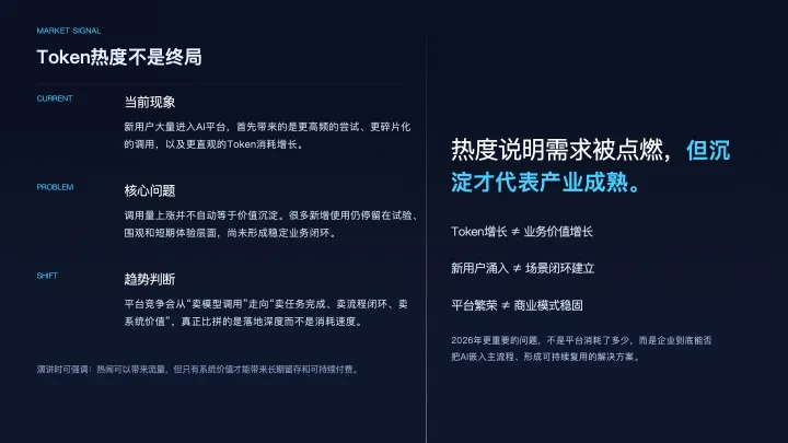 其中一个关键原因在于,很多新增使用者并没有真正形成完整的业务闭环。他们进入AI平台之后,首先带来的是更高频的尝试、更碎片化的调用和更直接的Token消耗,但并不意味着他们已经找到了长期可复用、可沉淀、可规模化推广的业务场景。换句话说,流量的增长不必然等于价值的沉淀,调用的增加也不必然等于解决方案的成熟。