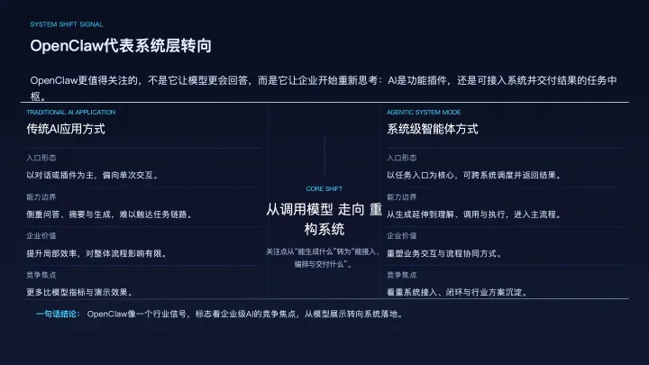 这正是为什么,以 OpenClaw 为代表的系统级方案更值得关注。它的意义不只是让模型“更会回答”,而是试图把模型能力放进更完整的企业任务链路里,让AI从一个对话入口,演变为一个具备任务理解、系统调用、流程协同与结果交付能力的智能体中枢。当企业真正开始从系统层考虑AI时,市场竞争就不再只是比拼谁的模型更强,而是比拼谁能更稳定地连接业务系统、谁能更低成本地完成流程改造、谁能更快地沉淀出行业级方案。