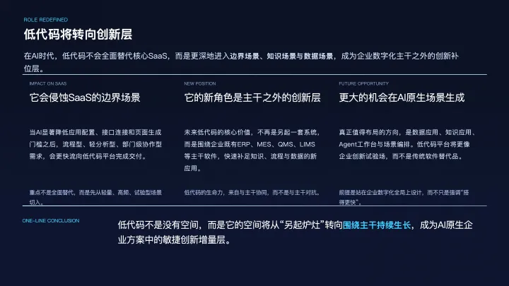 因此,低代码在2026年更可能承担一种新的角色:在企业数字化主框架确定之后,围绕框架边缘的知识、数据、流程与场景创新,提供快速生成与敏捷补位的能力。它不再是“另起一套系统”的代表,而是“在主干之外不断生长”的创新层。