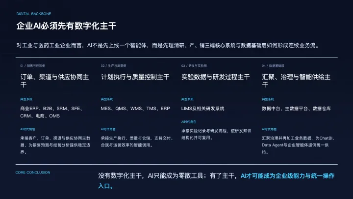 如果把2026年的企业AI落地看成一个整体工程,那么最关键的不是先上一个智能体,而是先明确企业数字化的主干线。没有主干线,AI只能成为零散工具;只有主干线清晰,AI才可能真正变成企业级能力。
