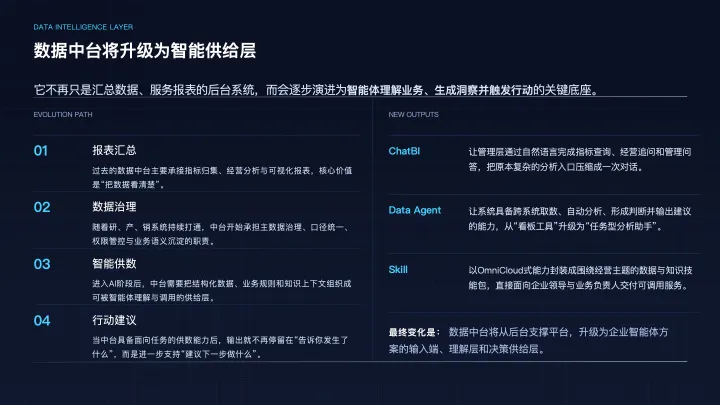 在这个结构中,数据中台的角色也会随之变化。过去很多企业建设数据中台,是为了报表汇总、指标归集和经营分析;但在AI时代,数据中台很可能进一步演化为智能体的数据供给层与知识组织层。也就是说,它不再只是一个“看数”的地方,而是一个“供给智能体理解业务、完成推理、生成动作”的中枢。